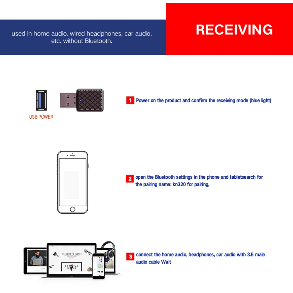 Беспроводной Bluetooth-приемник KN322 для стереозвука, передатчик, ключ для музыки 3,5 мм, Aux USB BT 5,0, адаптер для компьютера, динамика, MP3