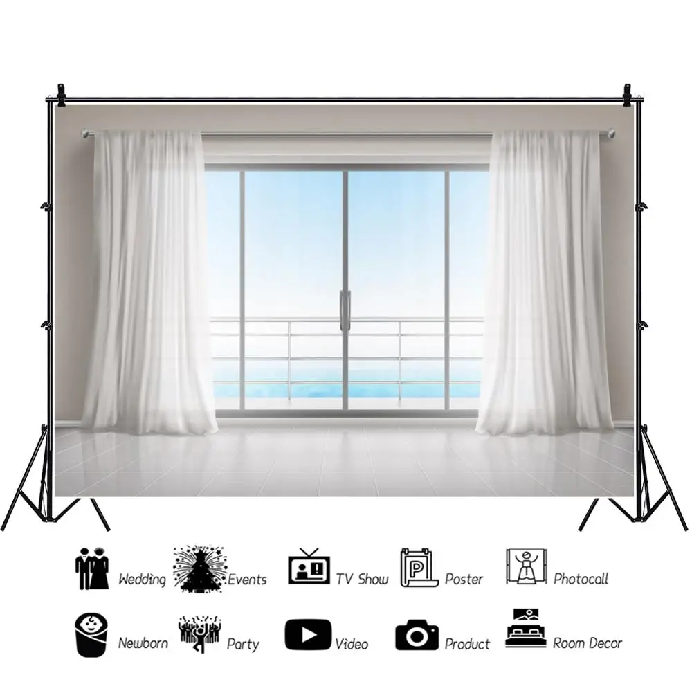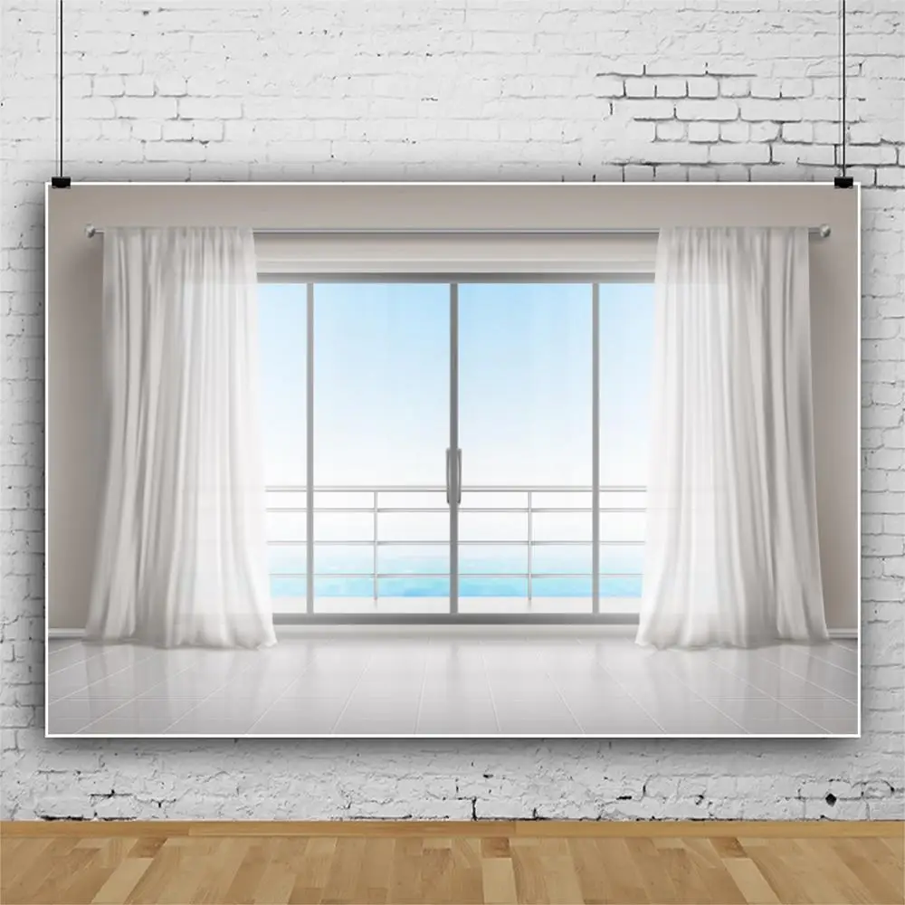 Laeacco, окно, балкон, перила, комната, Серый занавес, пол, домашний декор, интерьер, фотографический фон, фон для фотостудии