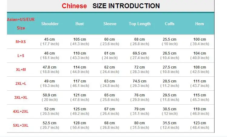 Плечо Бюст Рукав Длина верха Манжеты Подол M = XS 45 см (17,7 дюйма) 105 см (41,3 дюйма) 60 см (23,6 дюйма) 68 см (26,8 дюйма) 25,5 см (10 дюймов) 100 см (39,4 дюйма) L = S 46 см (18,1 дюйма) 110 см (43,3 дюйма) 61 см (24 дюйма) 69,5 см (27,4 дюйма) 26,5 см (10,4 дюймов) 104 см (40,9 дюйма) XL = M 47,8 см (18,8 дюйма) 114 см (44,9 дюйма) 62 см (24,4 дюйма) 72 см (28,3 дюйма) 27,5 см (10,8 дюймов) 108 см (42,5 дюйма) 2XL = L 49 см (19,3 дюйма) 117 см (46,1 дюйма) 63 см (24,8 дюйма) 74,5 см (29,3 дюйма) 28,5 см (11,2 дюймов) 111 см (43,7 дюйма) 3XL = XL 50,9 см (20 дюймов) 121 см (47,6 дюйма) 65 см (25,6 дюйма) 76 см (29,9 дюйма) 29,5 см (11,6 дюймов) 115 см (45,3 дюйма) 4XL = 2XL 52 см (20,5 дюймов) 125 см (49,2 дюйма) 67 см (26,4 дюйма) 79 см (31,1 дюйма) 30,5 см (12 дюймов) 119 см (46,9 дюйма) 5XL = 3XL 52,5 см (20,7 дюйма) 128 см (50,4 дюйма) 68 см (26,8 дюйма) 80 см (31,5 дюйма) 31,5 см (12,4 дюймов) 123 см (48,4 дюйма)Азиатский размер XL =Размер США M=Российский размер 44-46