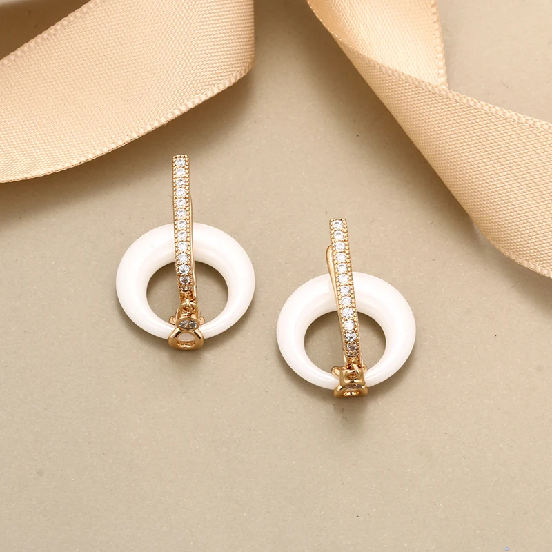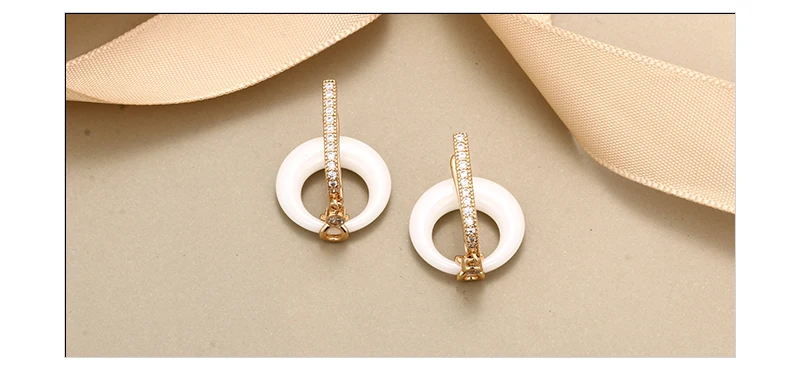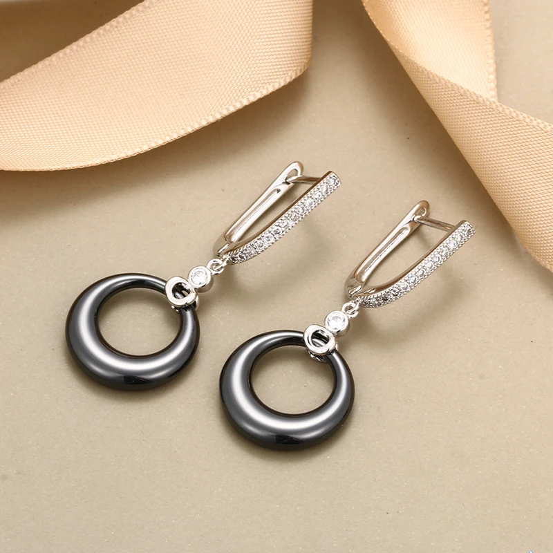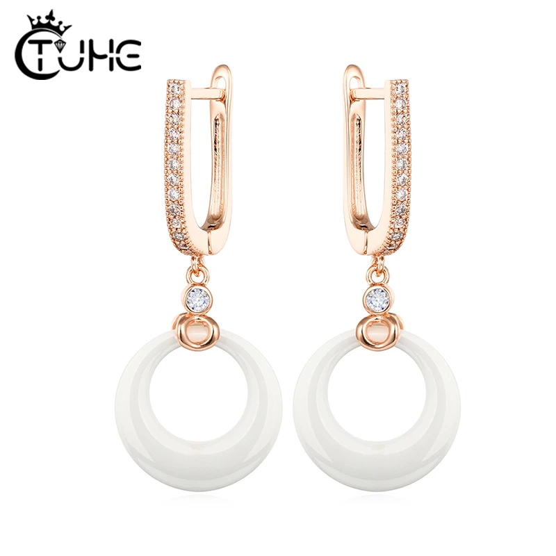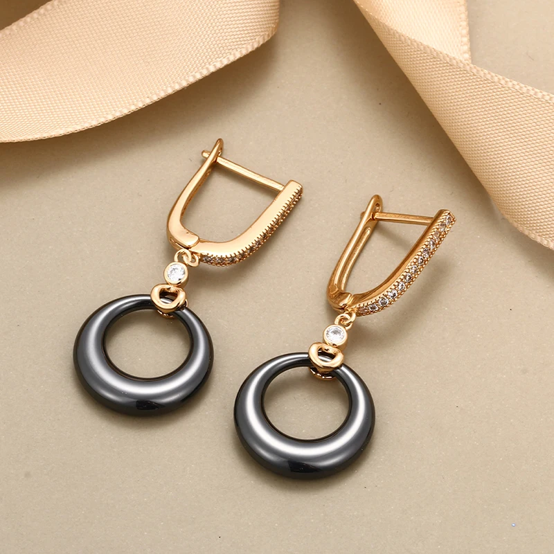 Серьги-кольца женские под розовое золото 585 пробы, висячие ювелирные украшения для ушей с кристаллами, свадебная бижутерия с черными и белыми круглыми керамическими элементами, висячие серьги