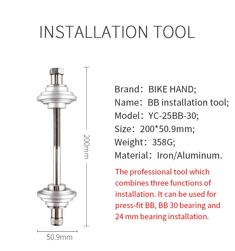 Инструмент для удаления и установки пресс-формы BBМодель: YC-25BB,YC-25BB-30;Цвет: черный, серебристый;Место происхождения: Тайвань;Материал: железо, алюминиевый сплав;Инструмент для удаления нижнего кронштейнаYC-25BB пресс-инструмент для удаления вв. Для Shimano Press-fit BB use. Инструмент для установки пресс-формы BBYC-25BB-30-это профессиональный инструмент, который сочетает в себе три функции установки. Он используется для установки подшипников BB, BB 30 и 24 мм.