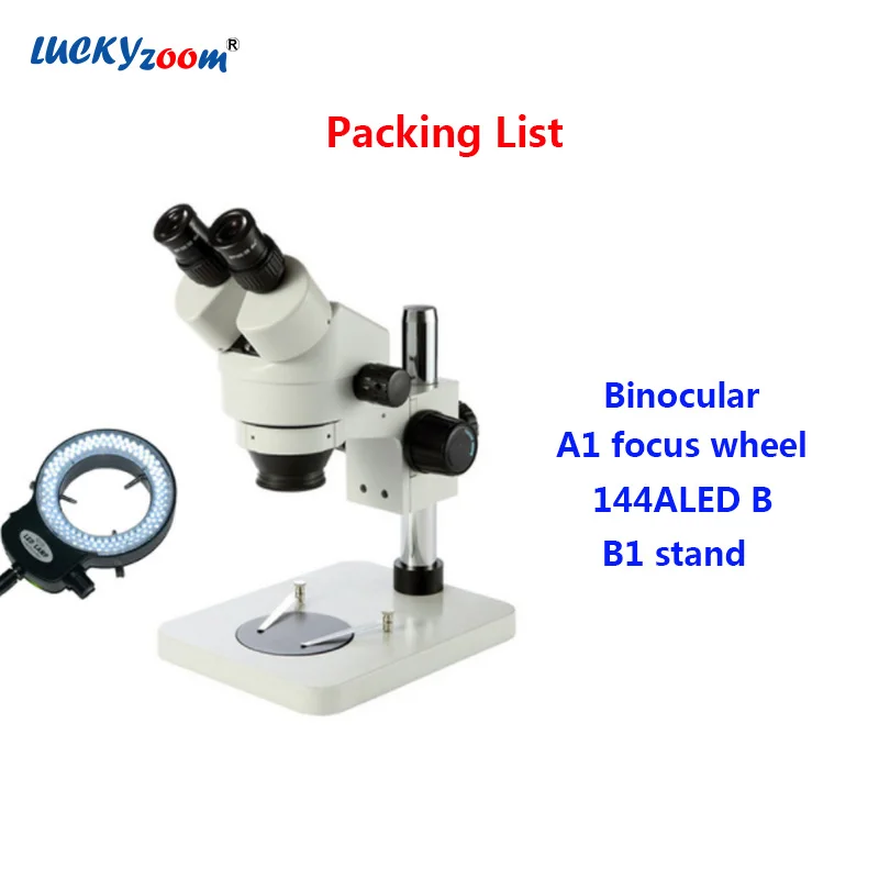 Бинокулярный стерео микроскоп с 144 светодиодным кольцевым светом (черный или белый в случайном порядке). B1 квадратная подставка, легко носить с собой, ее можно использовать для ремонта мобильных телефонов, проверки печатных плат и так далее. Рабочее расстояние составляет 100 мм, легко настроить и использовать, пылезащитный чехол включен. Упаковка из пенопласта, которая не может быть повреждена во время транспортировки.