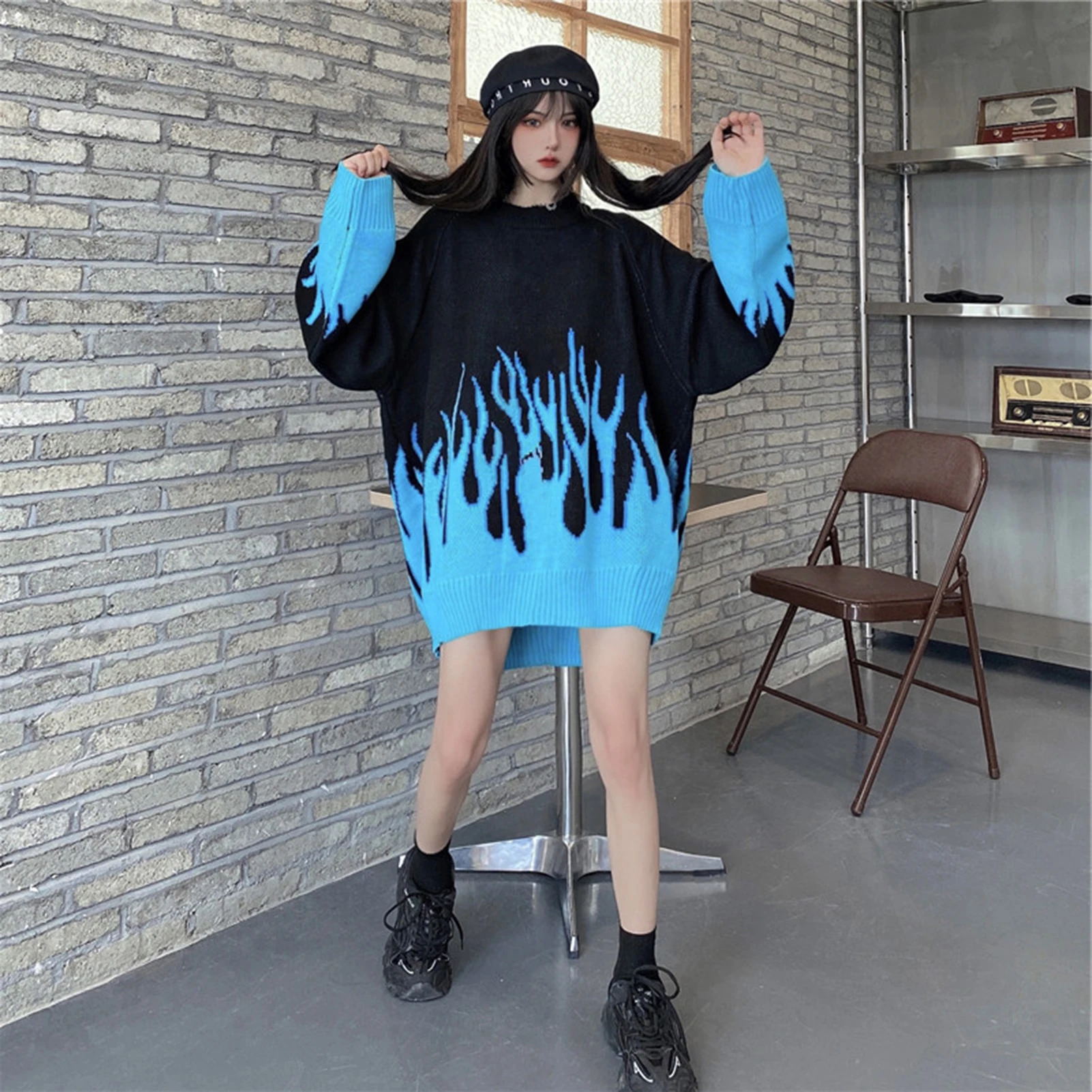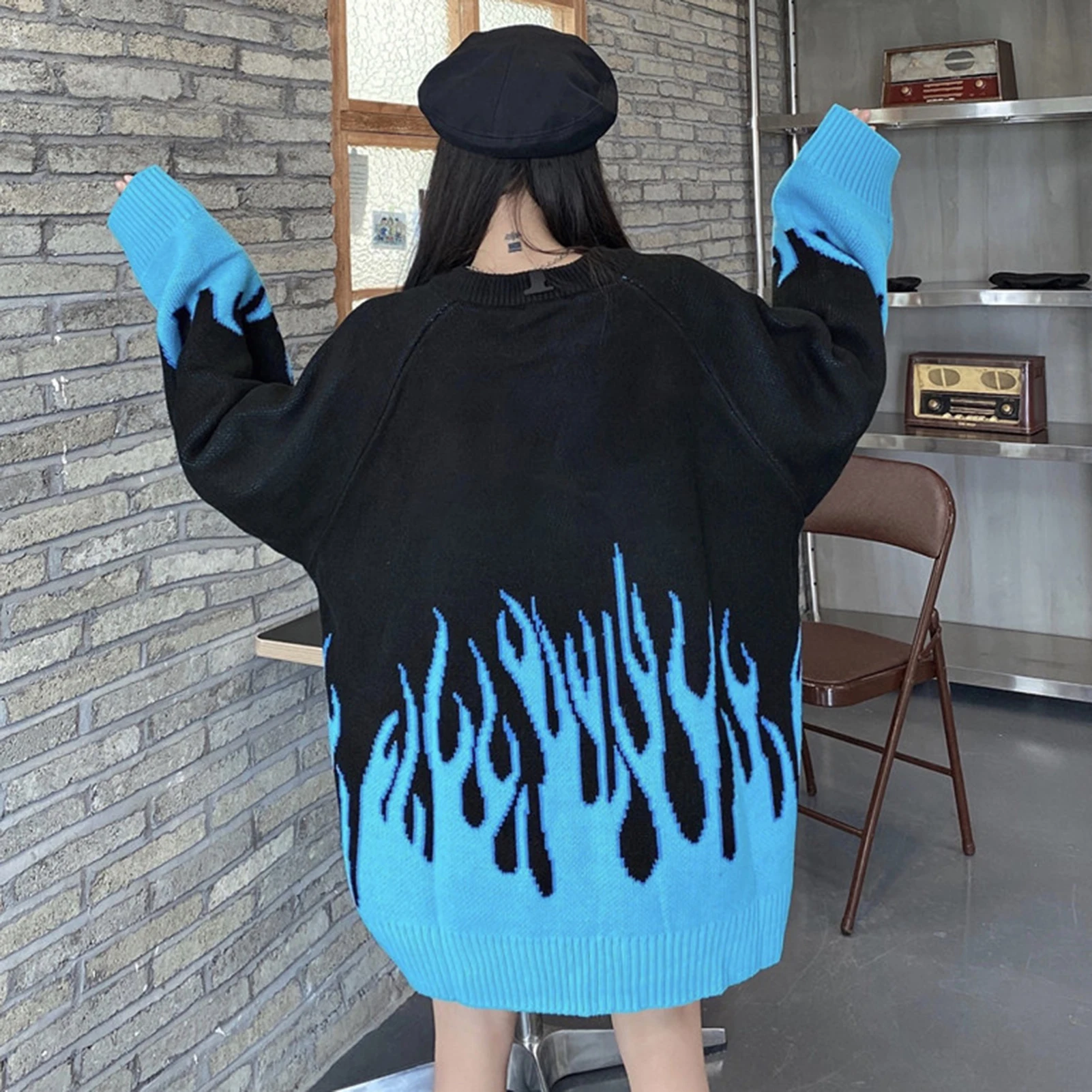 Женский свободный трикотажный свитер с О-образным вырезом размера плюс с цветным пламенем, пуловер, топы 2020, большие размеры, уличная одежда в стиле хип-хоп, женские свитера