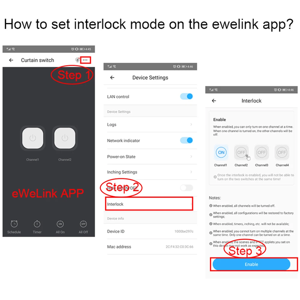 Режим инчинга: Включение канала 1, канал 1 будет автоматически закрыт через 0,7 секунды. Канал 2 совпадает с каналом 1. Самоблокирующийся: как обычный переключатель 2 каналов, каждый канал может быть включен/выключен отдельно. Внутренний замок: Включите любой 1 канал, другие каналы будут выключены автоматически.