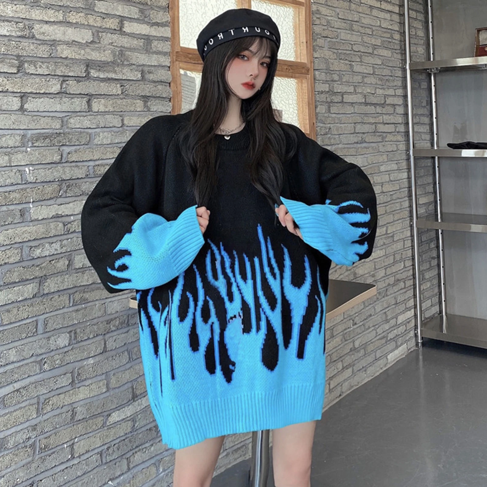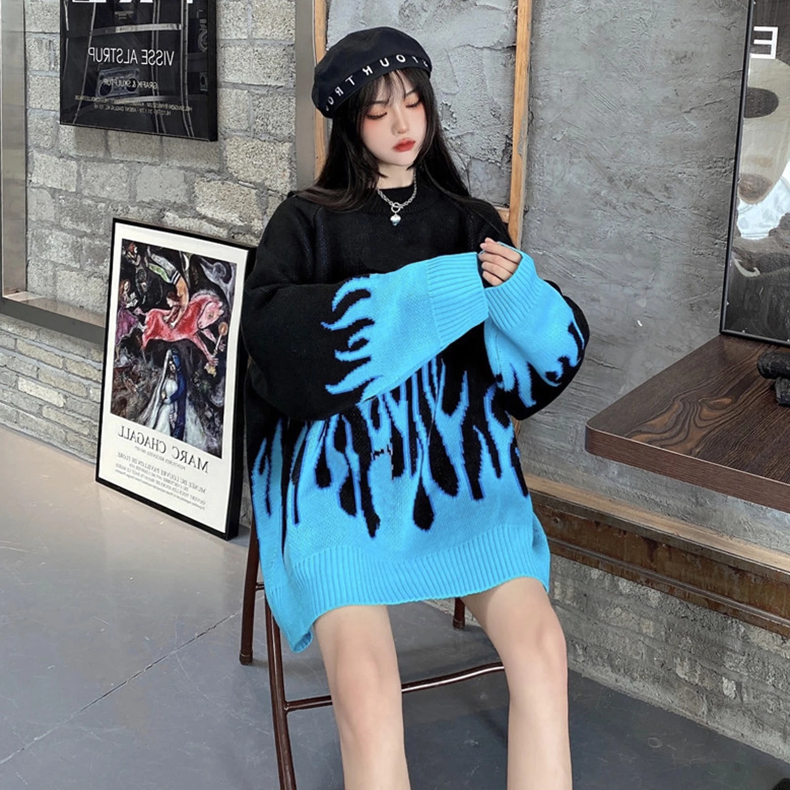 Женский свитер в стиле ретро с изображением пламени в стиле хип-хоп, Новинка осени, повседневные женские свитера оверсайз с круглым вырезом из спандекса
