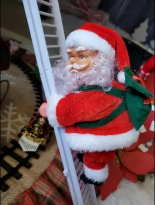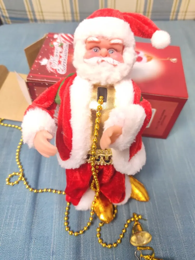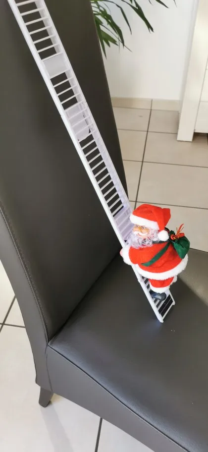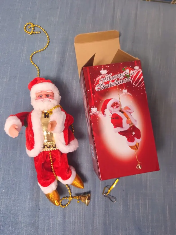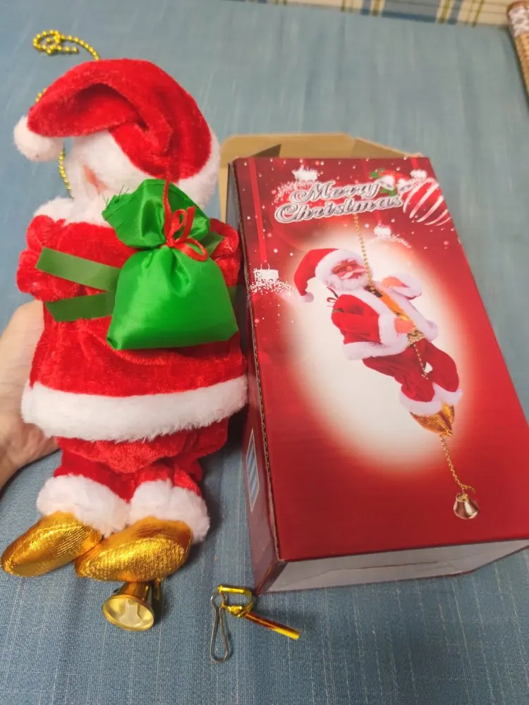 Этот Санта-Клаус был очень веселым, повесив его на нашу елку. У него очаровательное лицо. Вы видели роскошный красный и белый костюм. Возьмите зеленую сумку сзади. Когда вы включаете его, он вверх и вниз по лестнице, пока музыка звучит.