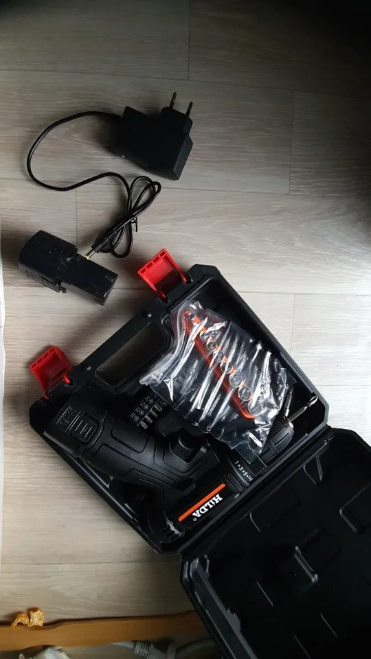 Приехал в Москву за несколько дней, принёс курьер на дом. В минимальном комплекте только чемоданчик и зарядка (хотя чемоданчик нафиг не упал, лучше б без него, но на сотню дешевле). В отличие от предыдущего такого же с наклейкой "Калайдун", немного болтается выключатель, немного труднее затянуть патрон, зато в редукторе все детали на месте :) Крутит нормально, редуктор жылезный. Просверлил в ручке дырку - теперь можно заряжать не вынимая аккумулятор.