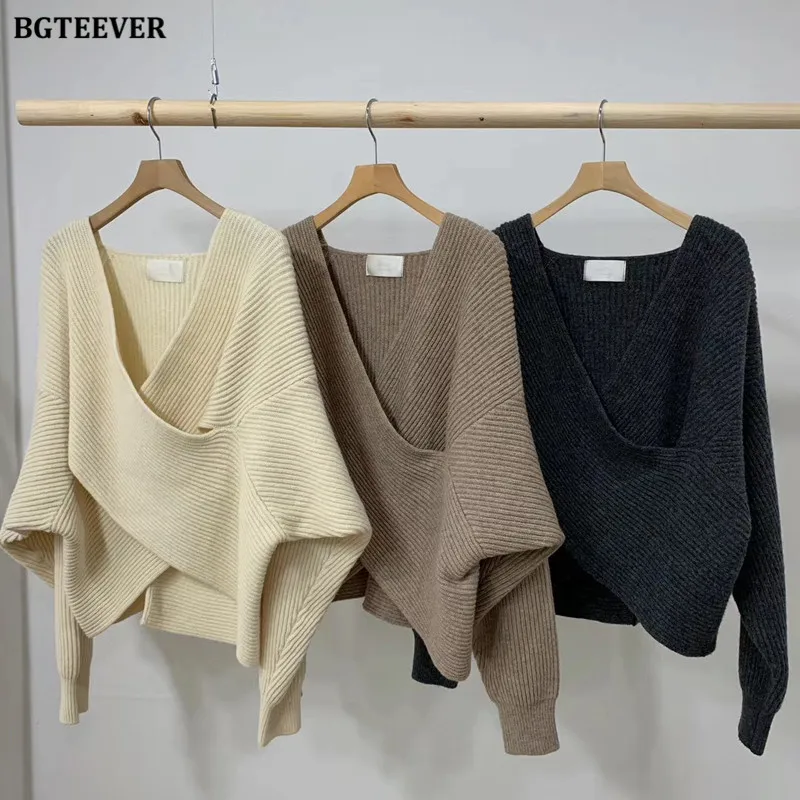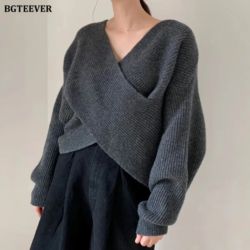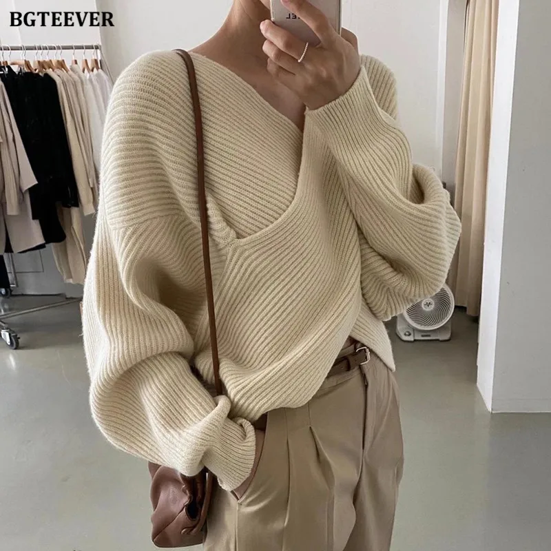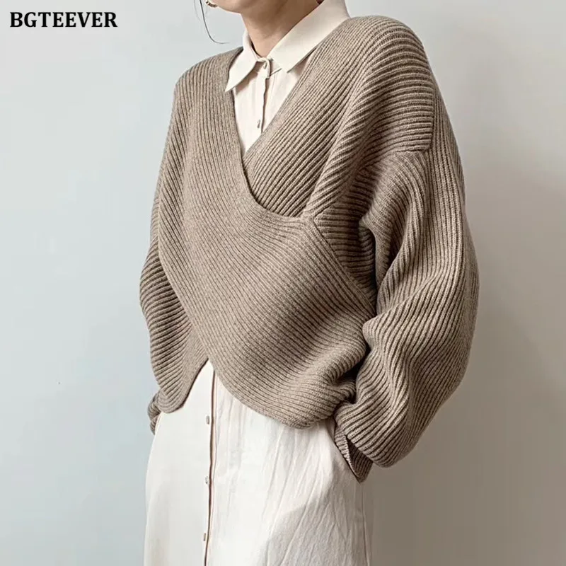 Женский трикотажный свитер BGTEEVER, свободный однотонный джемпер с V-образным вырезом в уличном стиле, Осень-зима