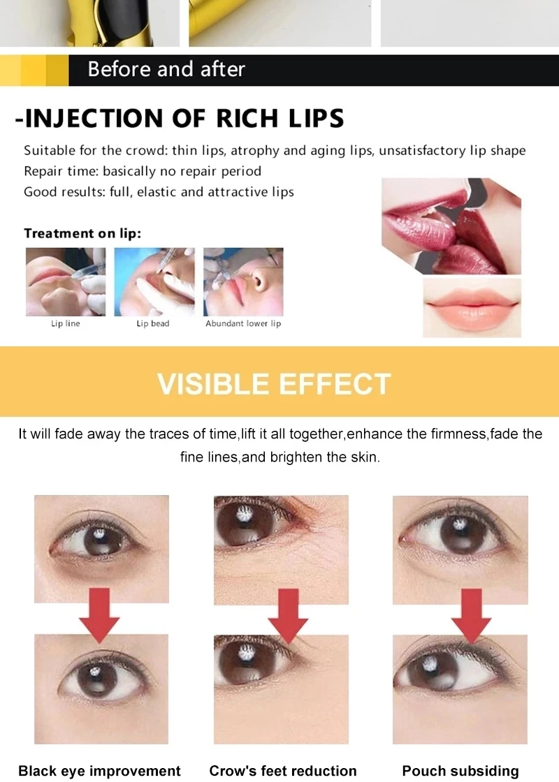 Описание товара: Тип 1: 2 в 1 ручка с гиалуроном Тип 2: ручка с двумя головками и гиалуроном Характеристики: заполнение губ, удаление кровеносных сосудов, омоложение кожи, темные круги, удаление морщин, потеря веса, увлажнение, отбеливание, увлажнение Материал: нержавеющая сталь 316 (Профессиональная Медицинская нержавеющая сталь) Объем впрыска: 0,3-0,5 мл Режим работы: распыление высокого давления Глубина впрыска: 6-15 мм Принцип работы: Пружина и поршень, которые позволяют под давлением, быстро и равномерно инъекционные наркотики под кожу через отверстие диаметром 0,1 мм, который находится в два раза меньше, чем иглы толщины для формовочной машины! С помощью энергии механического действия пружина и специальный поршень в аппарате позволяют, под давлением, быстро, но мягко толкая поток препарата через Микроскопическое отверстие в подкожной клетчатке. Препараты всасываются намного лучше и быстрее, чем с введением иглы, что было подтверждено в серии исследований и тестов, проводящихся в разных странах мира. Идеальное решение для тех, кто склонен к рубцам и подкожным клеткам. Преимущества гиалуроновой ручки: * Безболезненная инъекция * Инъекция без иглы устраняет риск заражения иглой * Не оставляет шрамов и следов от проколов кожи иглой * Лучшее и быстрое поглощение лекарственных средств * Строго Подкожная инъекция-устраняет риск проникновения препарата в мышцы * Быстрый, легкий и безопасный * Отдельная и экономичная дозировка препарата
