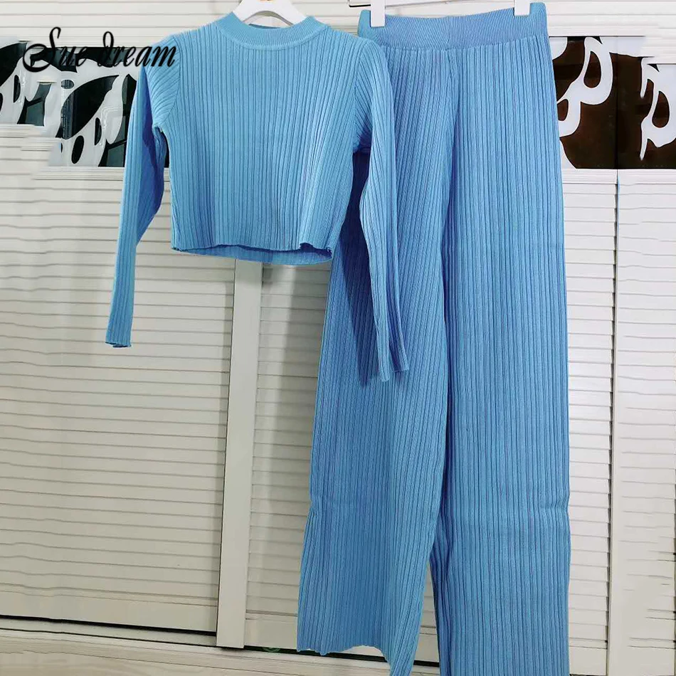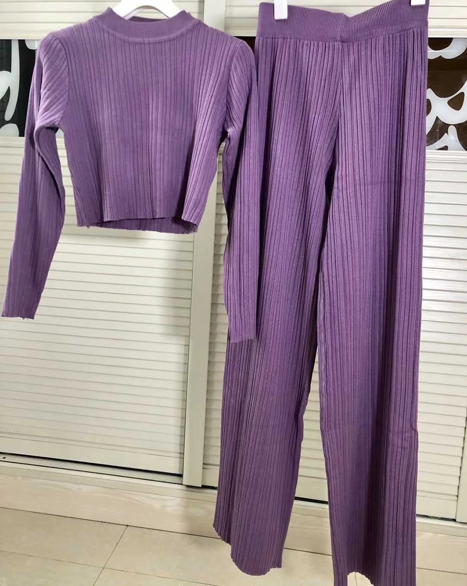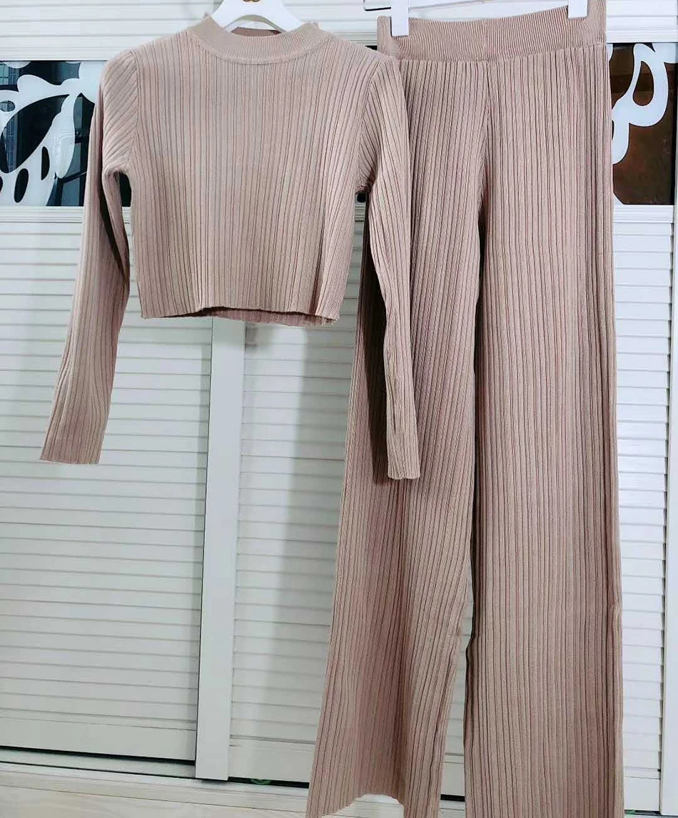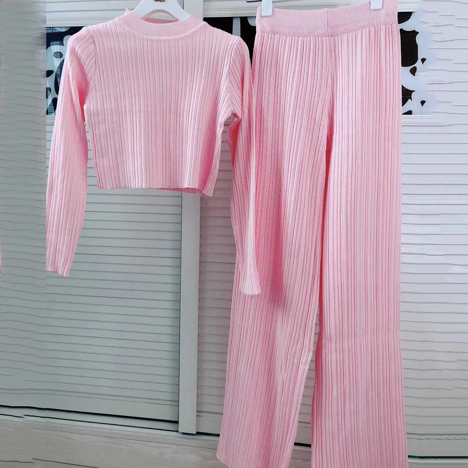 Новинка лета 2021, женский модный сексуальный комплект из двух предметов, трикотажный топ с длинным рукавом и круглым вырезом и широкие брюки с завышенной талией