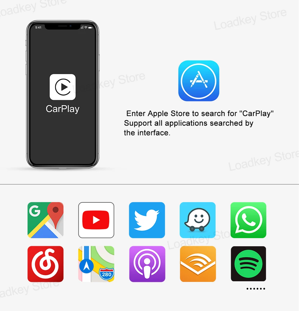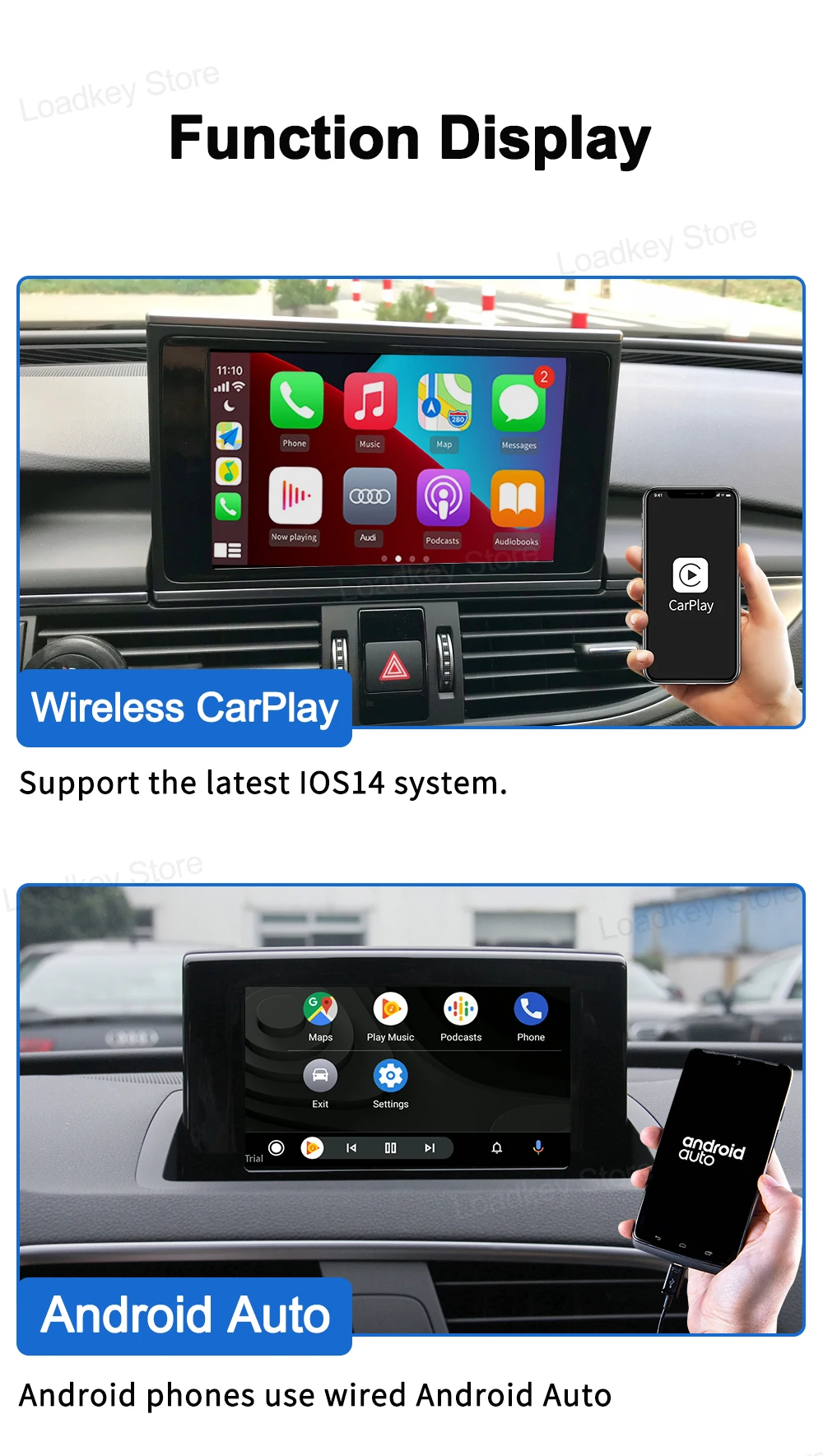 1. Работает с беспроводным Apple CarPlay, сопряжение через Bluetooth, передача через WIFI.2. Работает с проводным CarPlay также, сначала выключите Wi-Fi, подключите через кабель освещения (проводное Удерживайте телефон одновременно)3. Android Mirroring-Link для телефонов Android (ссылка для скачивания)4. GPS навигационные приложения, Google Maps, Waze и Apple Maps доступны, информация о живом движении5. Музыка яблоки Spotify,Apple Music, Amazon и т. Д. Аудио через фабрику Audi media, текст на дисплее для некоторых приложений.6. Голосовое управление, говоря "Эй Siri...""7. Aftermarket фронтальный/задний/360 вход камеры. (Поддерживаются динамические Направляющие линии)8. USB флэш-накопитель для воспроизведения музыки и видео с помощью подключения USB порта от CarPlay kit9. Регулировка эквалайзера. Лучшее качество звука. Выберите свой любимый стиль свободно (поп, рок, мягкий, стандартный ..)10. Полное управление кнопками OEM.