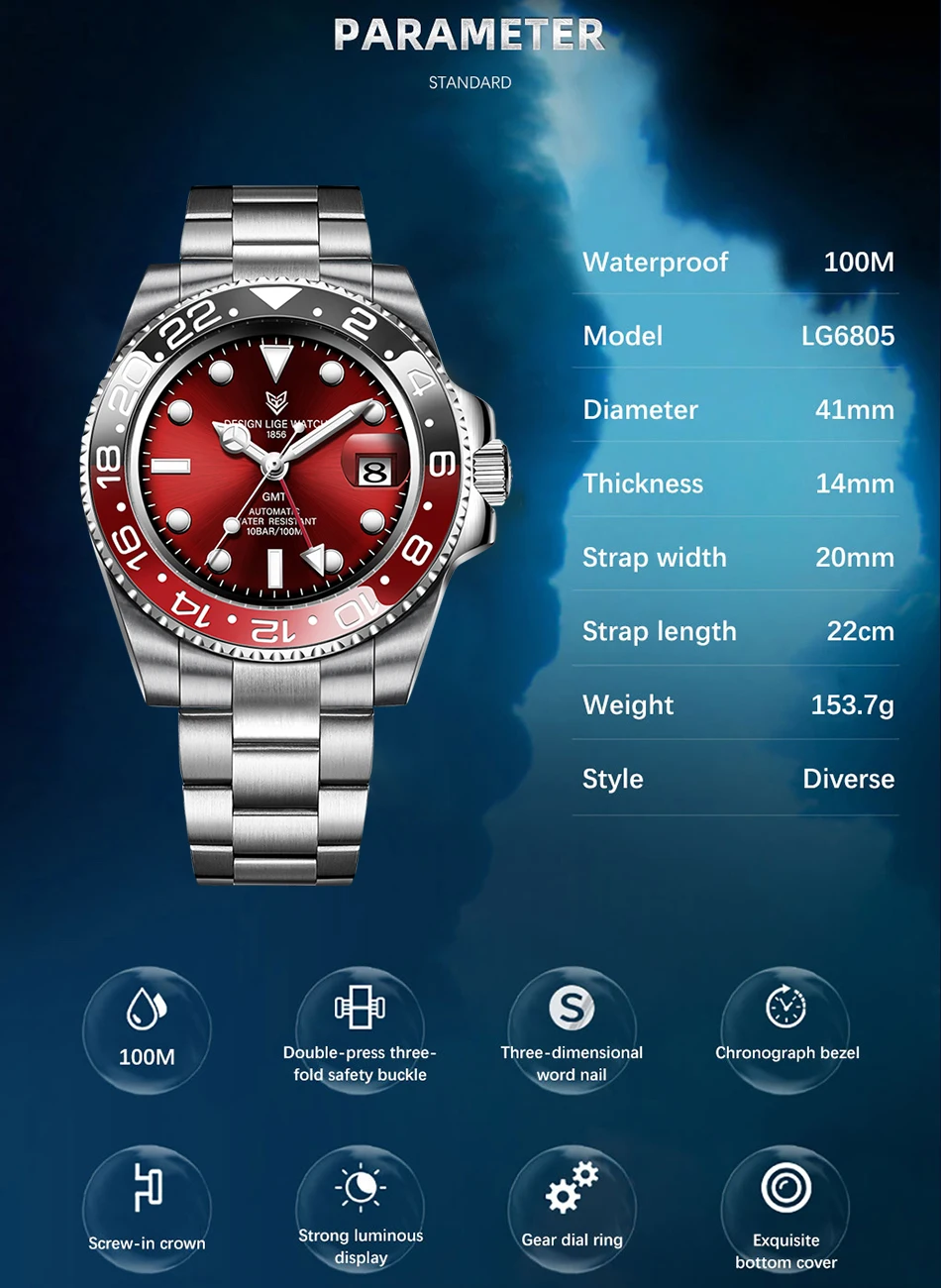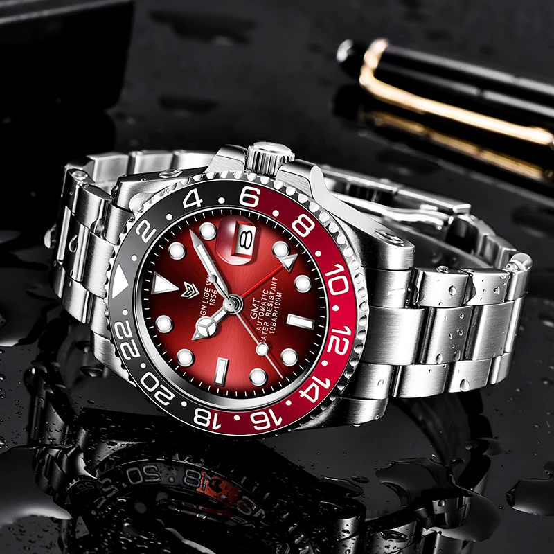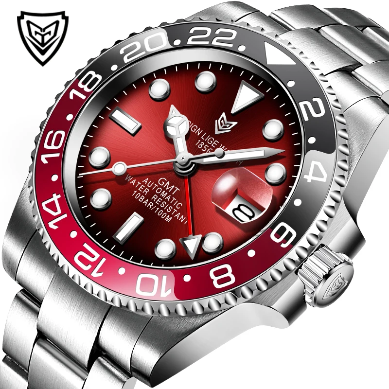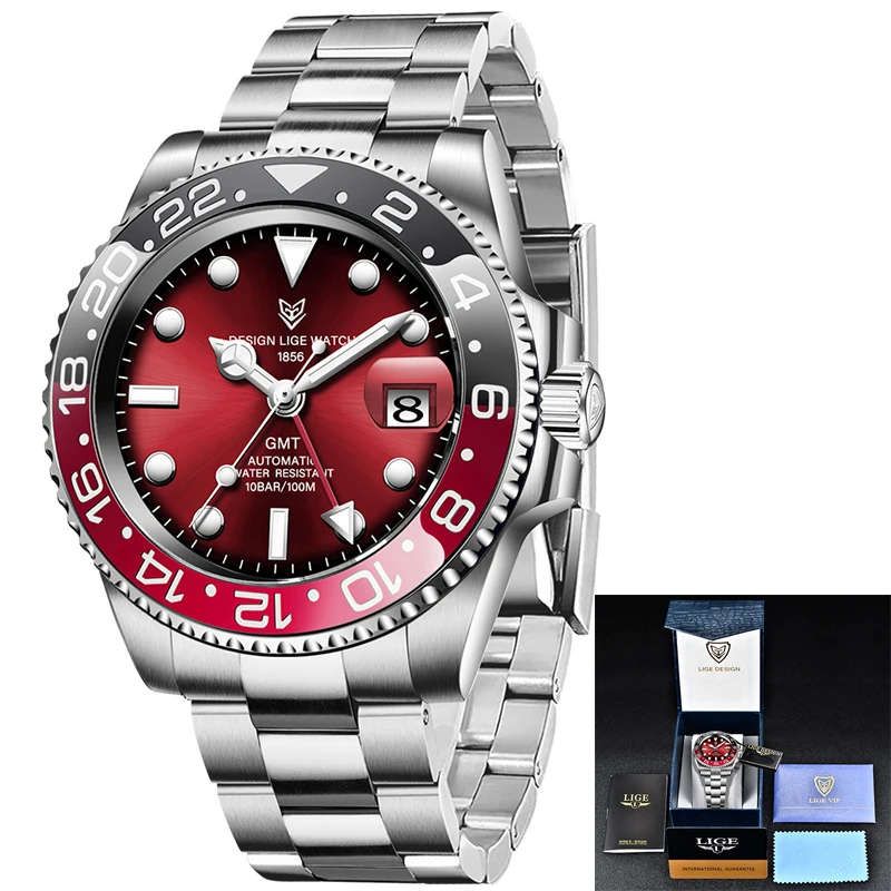 Часы наручные LIGE Мужские автоматические, брендовые роскошные механические из нержавеющей стали с сапфировым стеклом, GMT, 2020