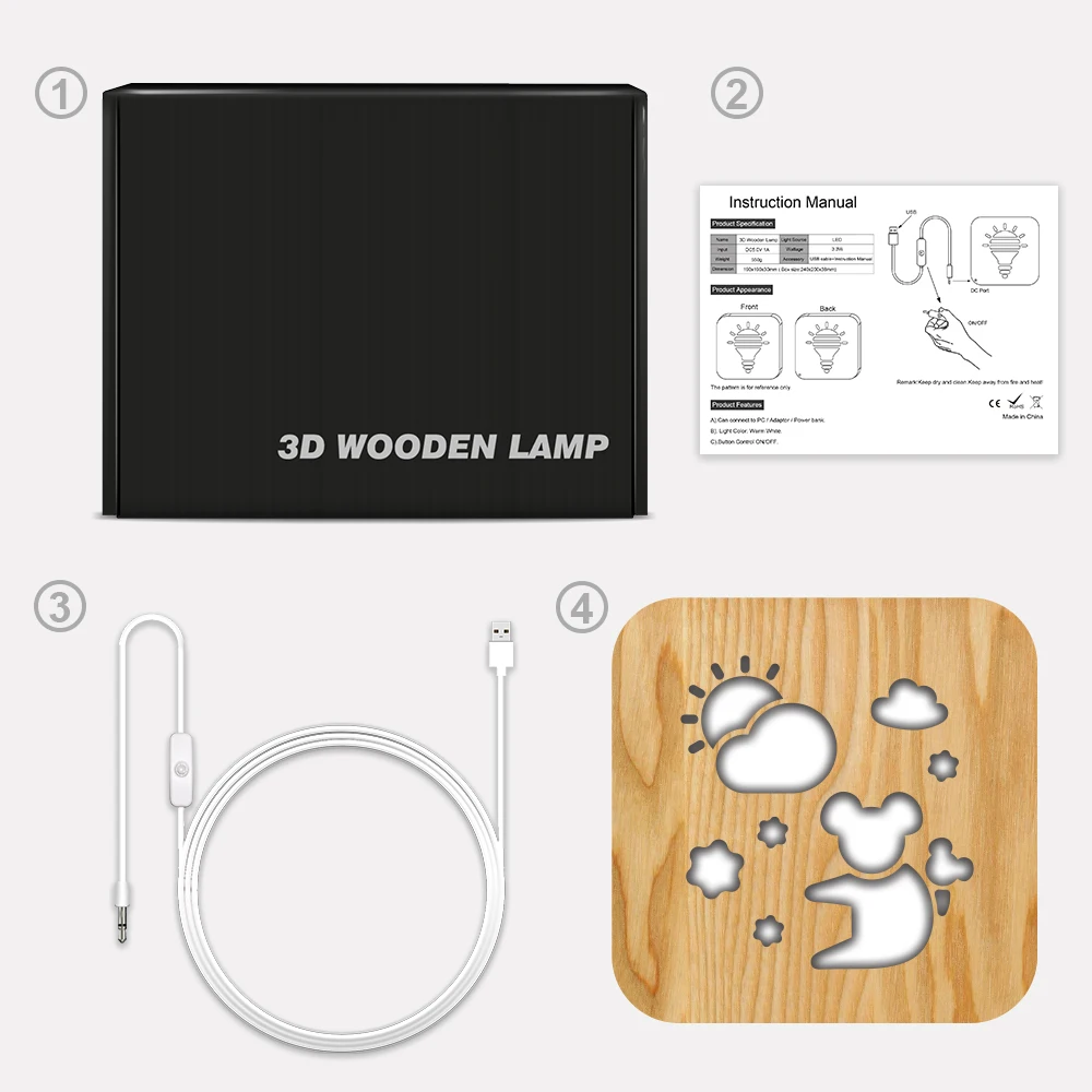 Цвет излучения: теплый белый Питание: источник питания USB Режим переключения: кнопочный переключатель Основной материал: дерево