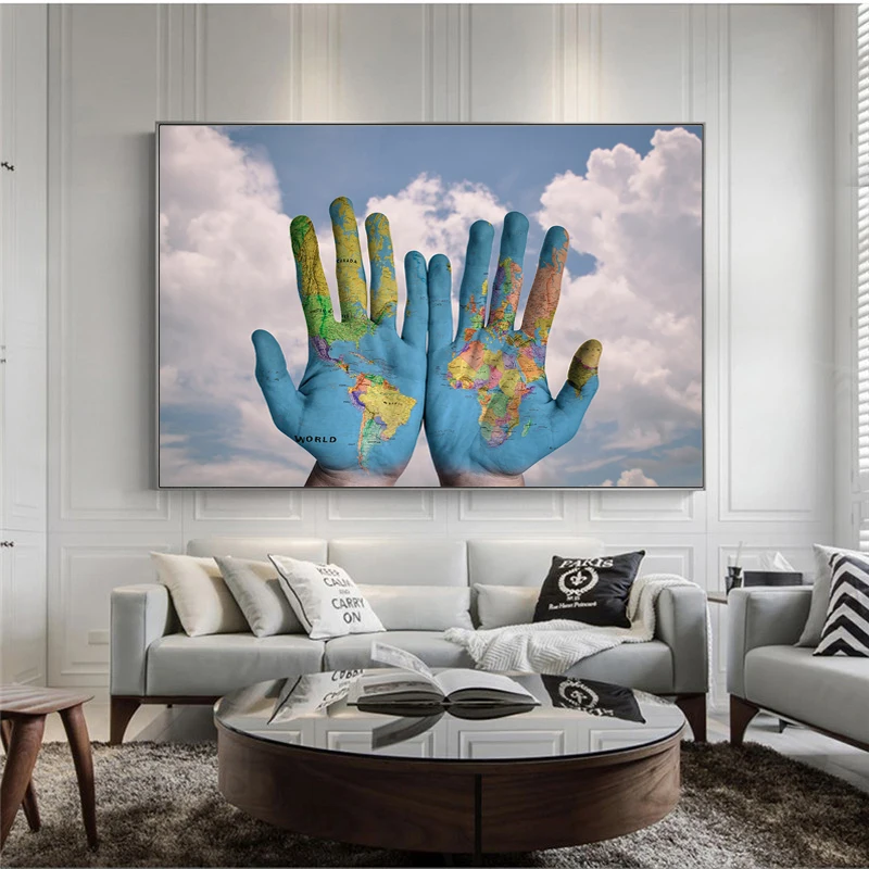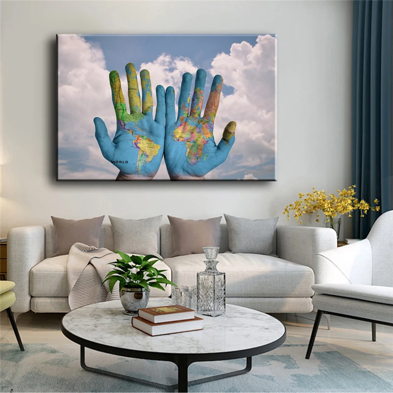 Абстрактная плоская карта мира на руках, настенные художественные плакаты с принтами, настенная живопись на холсте, картины для гостиной, домашний Настенный декор