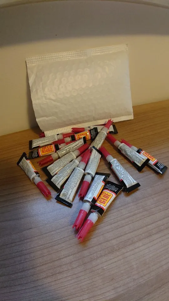 шел долго, продавец указал другой номер телеефона, поэтому поылки небыло в приложении, все коробки от 502 раздербанены, такое ощущение что таможенники искали чем попудрить носик(лучшеб внимательнее осматривали самолеты мида), но сам клей в норме.
