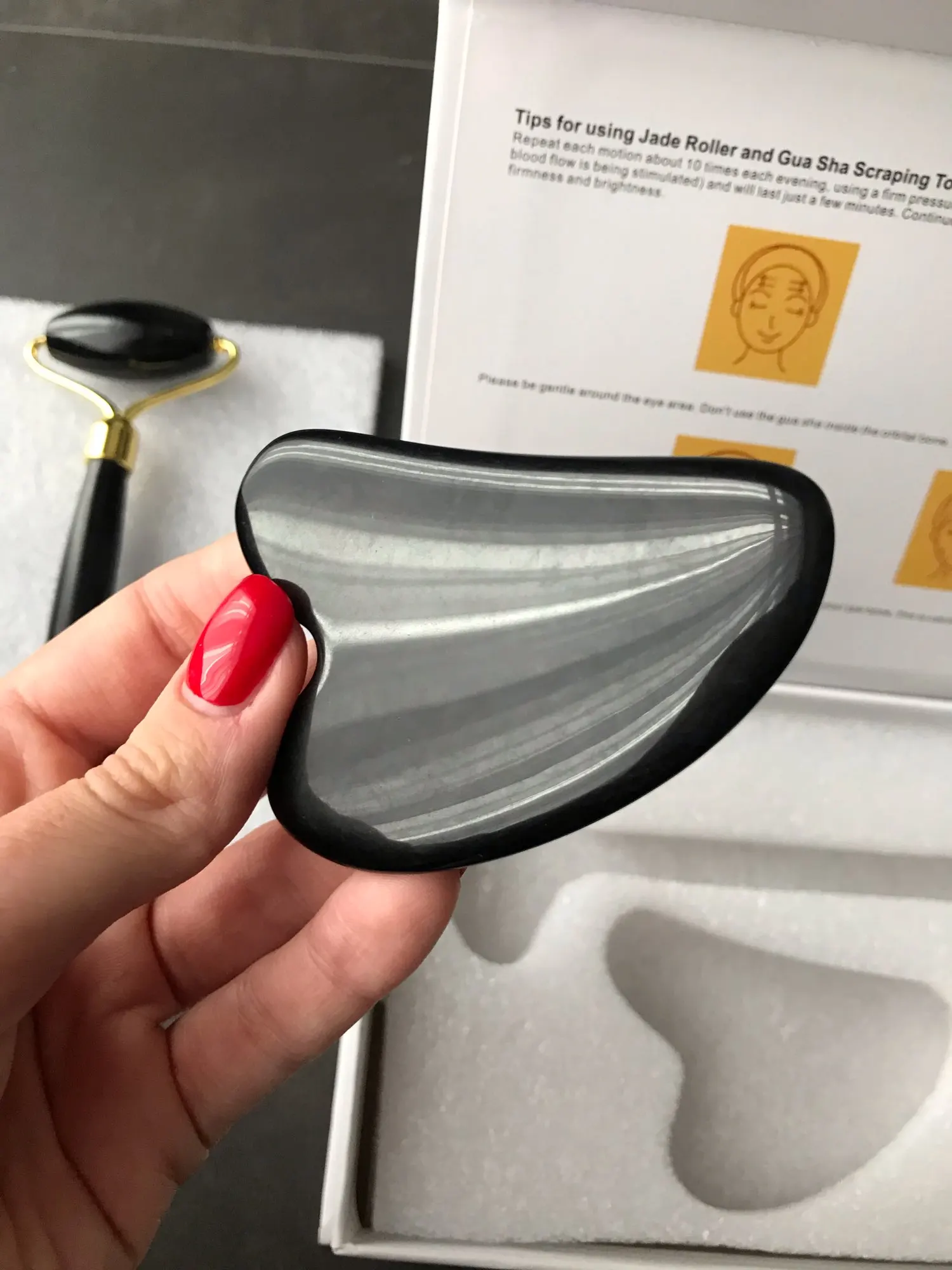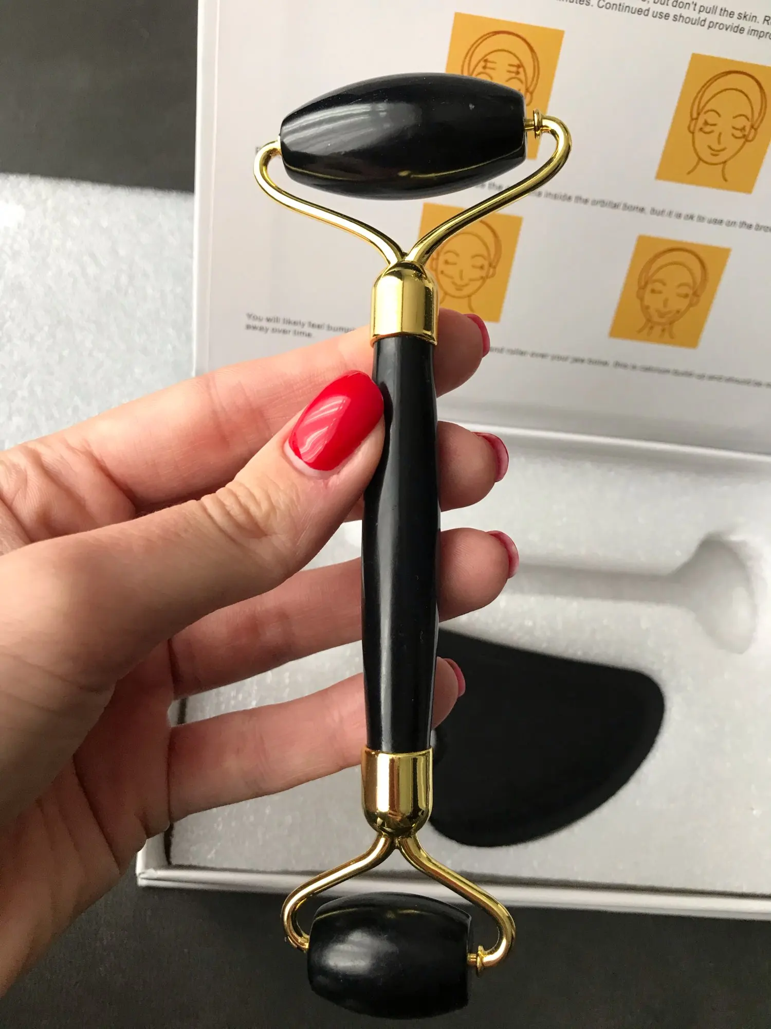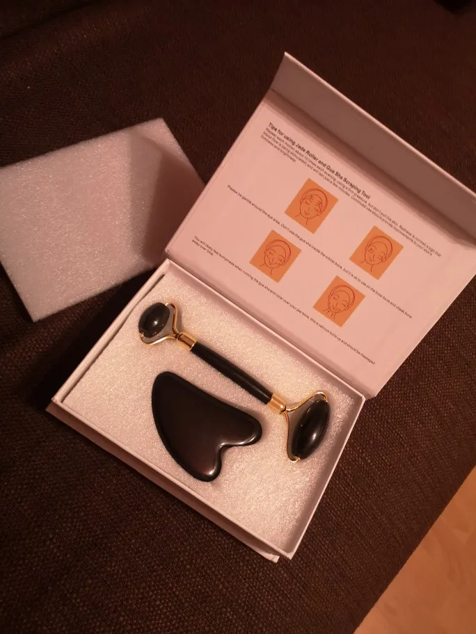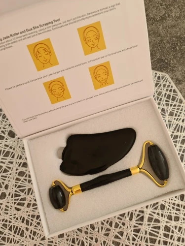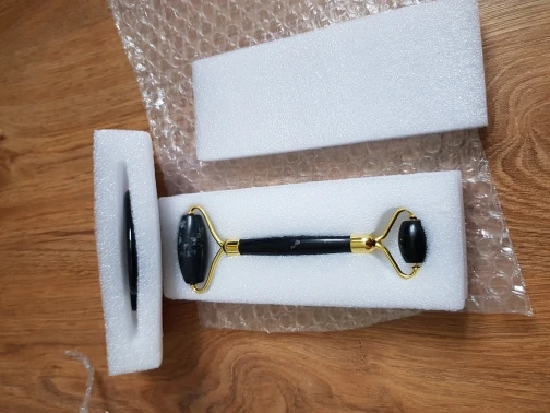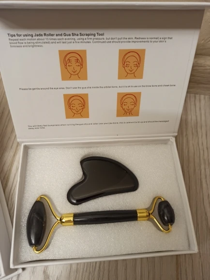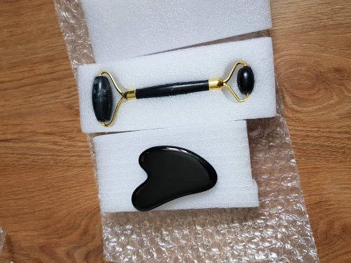 доставка около трех недель. упаковано безопасно, пришло всё целое. выглядит красиво. роллер приятно катать по лицу по массажным линиям. скребок тоже хорош, если использовать его с маслом для массажа лица. но не уверена, настоящий ли камень. возможно керамика, утверждать не могу, не очень разбираюсь. черный цвет выглядит стильно, но при первом же мытье появились коцки на скребке. с продавцом не общалась