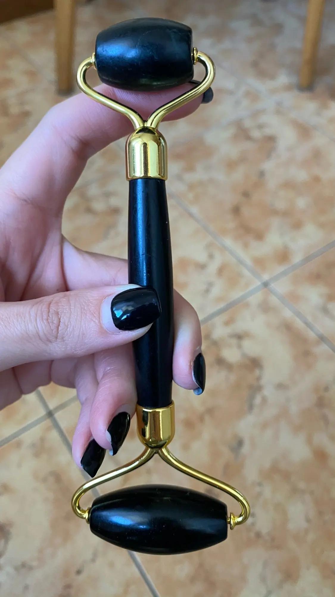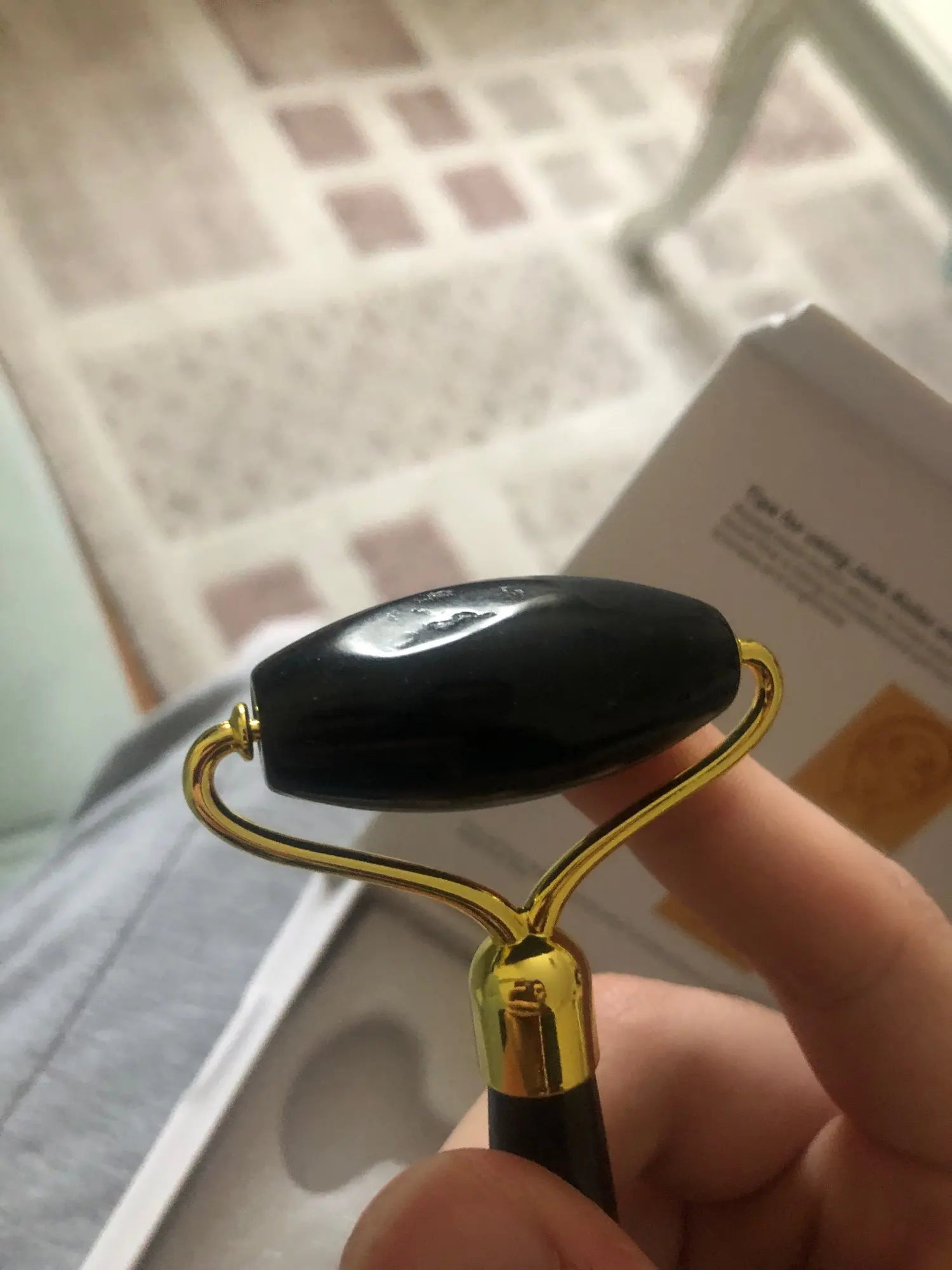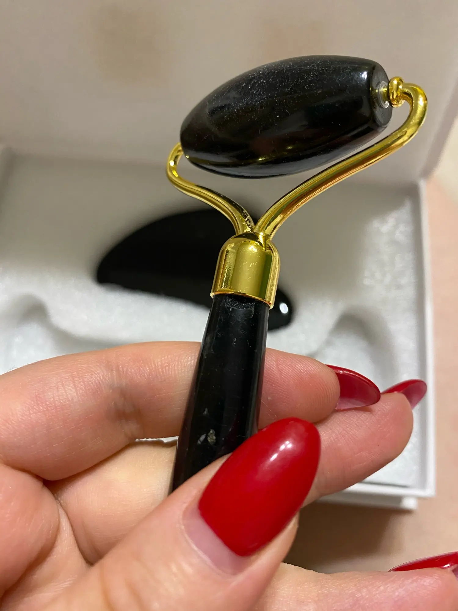 доставка около трех недель. упаковано безопасно, пришло всё целое. выглядит красиво. роллер приятно катать по лицу по массажным линиям. скребок тоже хорош, если использовать его с маслом для массажа лица. но не уверена, настоящий ли камень. возможно керамика, утверждать не могу, не очень разбираюсь. черный цвет выглядит стильно, но при первом же мытье появились коцки на скребке. с продавцом не общалась