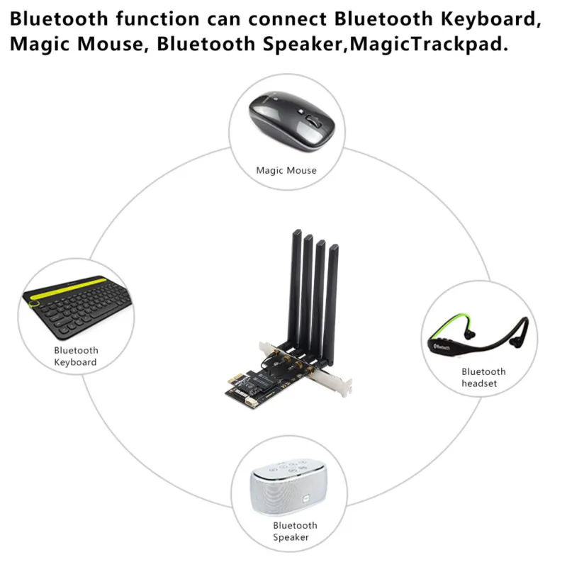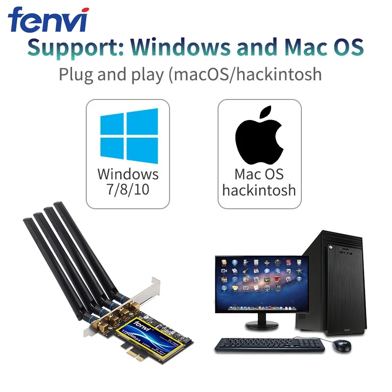 Модель: FV-A436CDChipest:Broadcom BCM94360Тип: Wi-Fi 802.11ac и Bluetooth 4,0Скорость до 1300 Мбит/сПоддержка Bluetooth 4,0Двухдиапазонный 2,4 ГГц/5 ГГцС антенной 4 шт. 6 дБПоддержка Windows 10/Hackintosh/MacOSXСистемные требования: ПК/Hackintosh Mac OS X 10,10, 10,11, 10,13, 10,14Примечание: Функция Bluetooth не работает на MacOSX 10,12, спасибо.Windows 10/11 (с установленными драйверами)Особенности:Поддержка сетей HACKINTOSHNative не поддерживает другие kext или любые необходимые патчиНет необходимости в запасной клавиатуре, чтобы получить доступ к BIOS/UEFI или загрузчикуNative Airdrop поддержка Native Handoff Поддержка OS X Yosemite 10,10 или более новаяПоддержка клавиатуры Apple Bluetooth, Magic Mouse, Magic TrackpadПоддержка удаленного подключения к 2,4 & Wi-Fi 5 ГГц двухдиапазонный, до 1300Mps с маршрутизатор переменного токаСистемные требования:ПК/HackintoshOS X 10.8.5 или более поздняя версияДля AirDrop, Handoff и непрерывности, OS X 10,10. x Yosemite или более поздней версии необходимоMac OS X 10,10, OS X 10,11 El Capitan, macOS 10,12 Sierra, macOS 10,13 High Sierra, macOS 10,14 Mojave