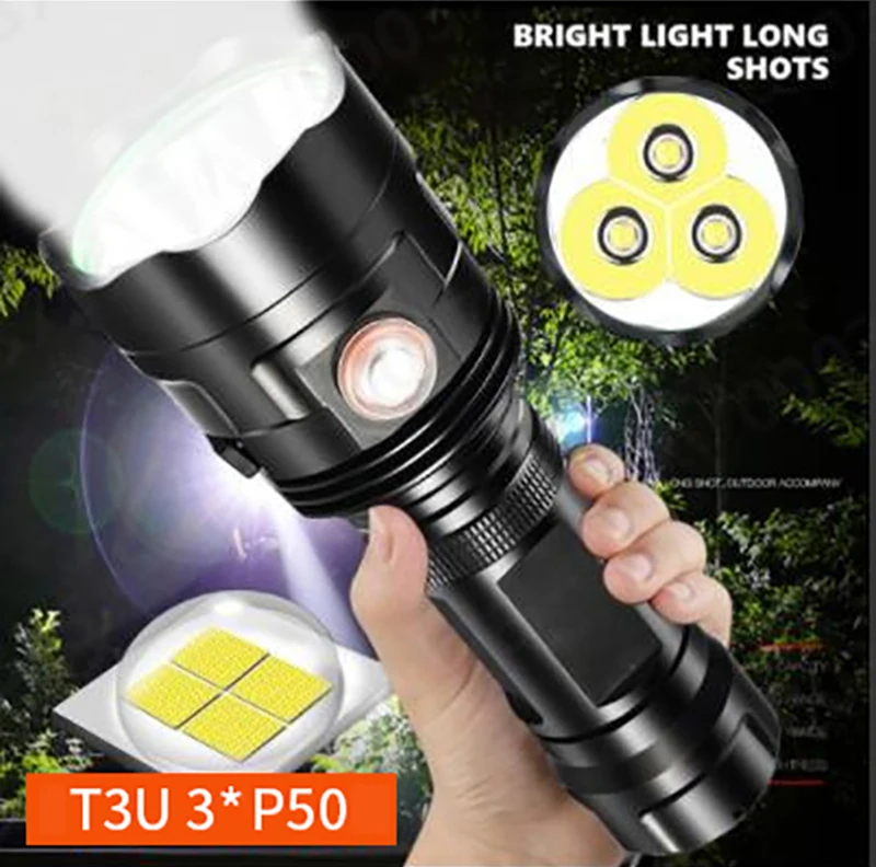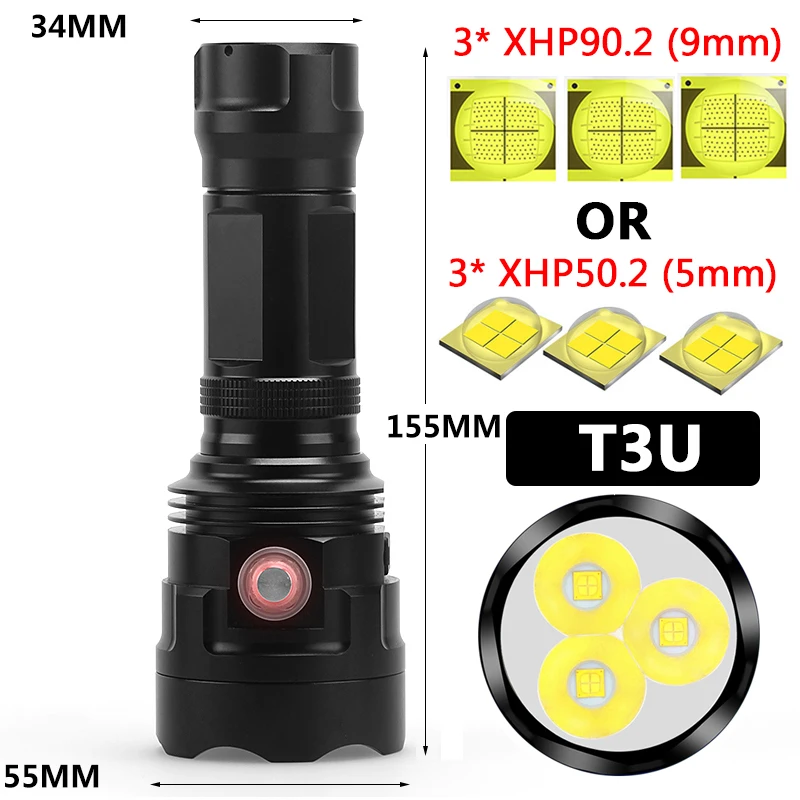 Модель: T3UМатериал: алюминиевый сплавМодель лампы: 3 * XHP50.2 / XHP90.2Режим освещения: высокий/низкий/SOSСпособ зарядки: Micro USB зарядкаАккумулятор: 26650 аккумуляторная батарея