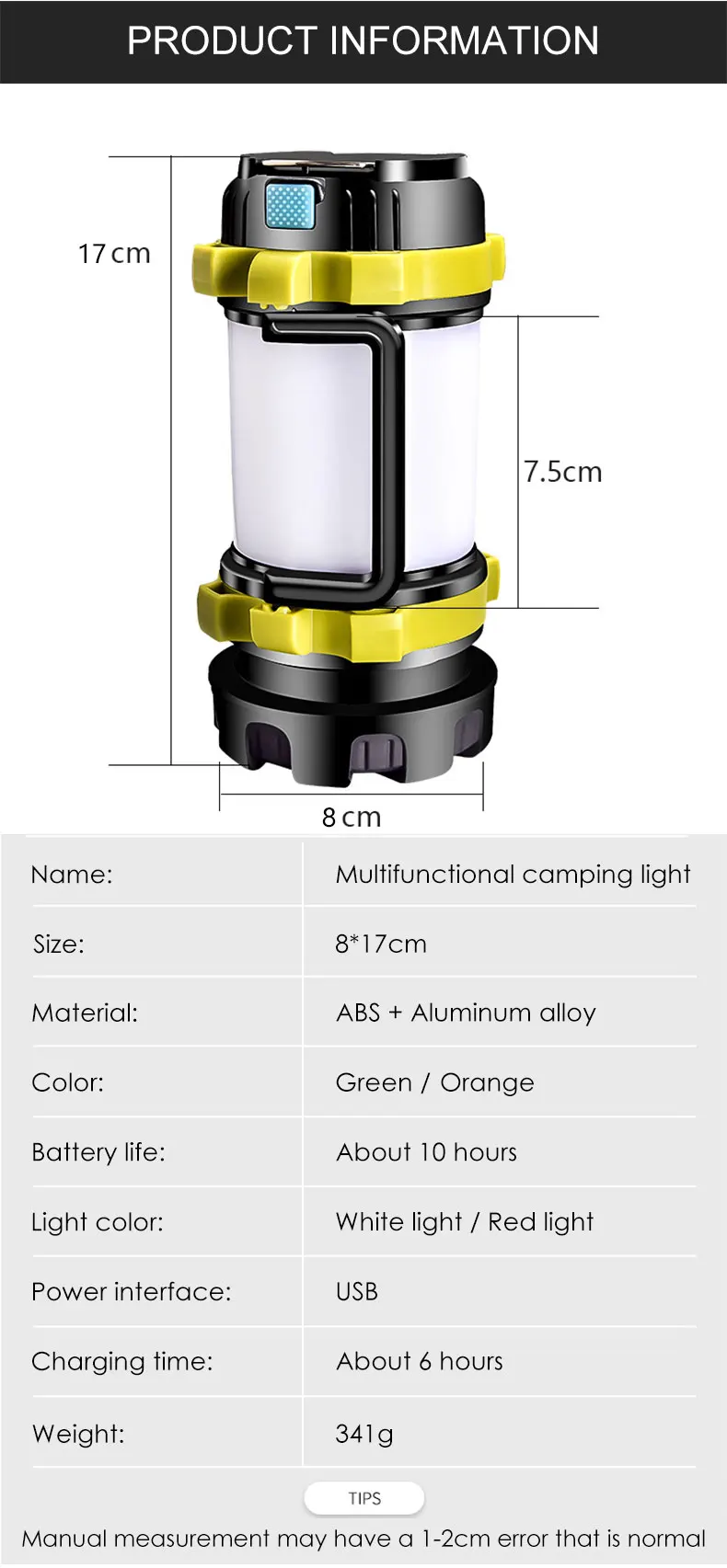 Светильник Цвет: белый светильник/красный светильникСрок службы: около 10 часовСветильник Цвет: белый светильник/красный светильникВнешний источник питания: USBВремя зарядки: около 6 часовВес: 314 гСоветы:Из-за ручного измерения размер может отличаться на 1-2 см. Надеемся на ваше понимание.