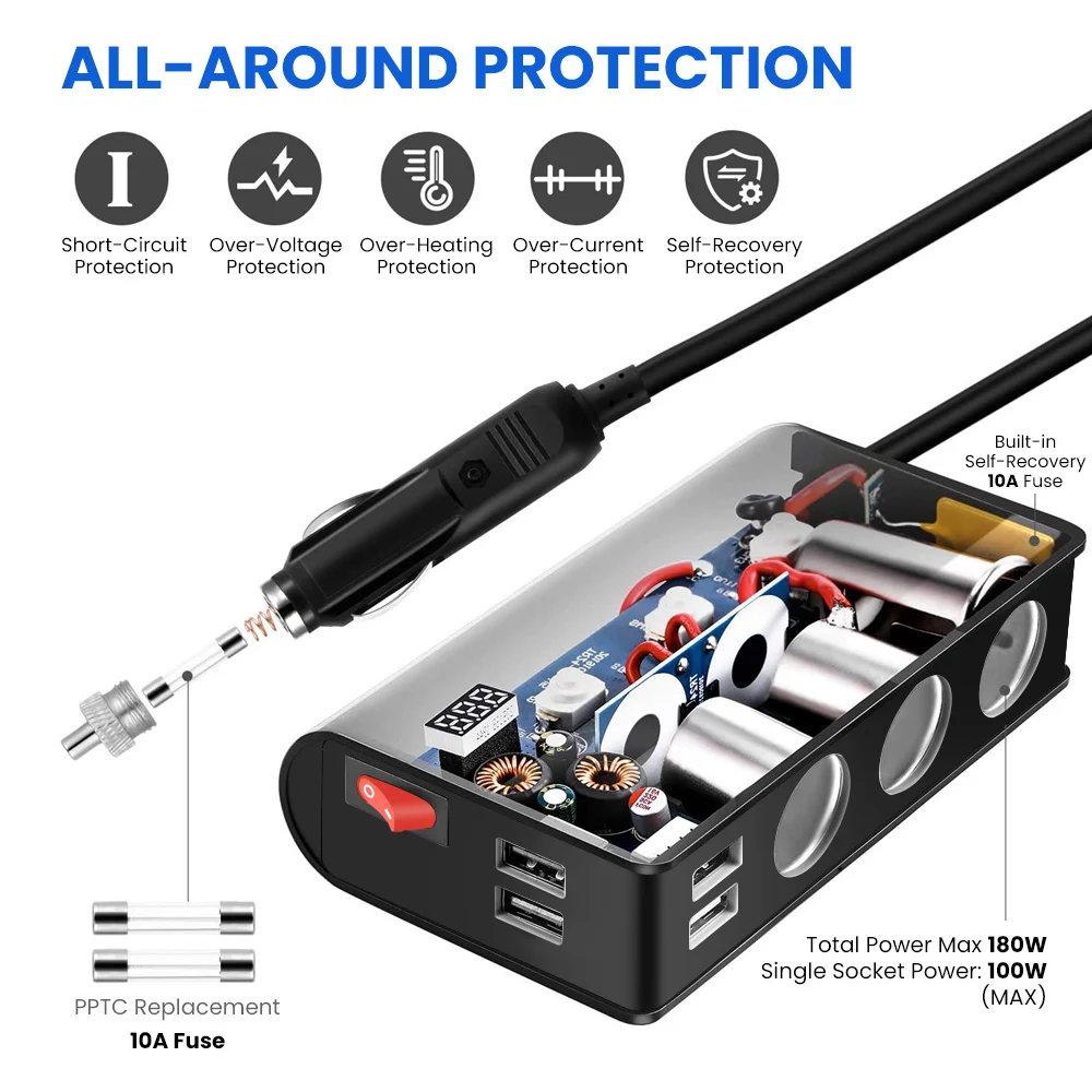 ✔【Higher Power】Equipped с 4-портовый USB розетки и 3 отверстия гнездо для автомобильного прикуривателя, которые обеспечивают 180 Вт Выходная мощность в общей сложности. Достаточно для одновременного использования различных портативных приборов, подходит с Dash Cam, GPS, очиститель воздуха, радар-детектор, Sat Nav, подогреватель сиденья, увлажнитель автомобиля, автомобильный вентилятор, iPhone, iPad, планшет и т. д.✔【Более Быстрая зарядка 】обновленный usb-порт быстрой зарядки может заряжать устройства быстро, до 4X быстрее, чем обычная зарядка. Встроенная технология smart IC позволяет обнаруживать все подключенные устройства и обеспечивает оптимальную самую быструю скорость зарядки.✔【Функция прикуривателя 】одно из трех отверстий прикуривателя имеет функцию прикуривателя, которая может удовлетворить потребности курильщиков. (Он должен использоваться вместе с оборудованием для прикуривателя, не предоставляется). Другая сигарета 2-3 не может зажигалить сигареты, и каждая розетка может обеспечить максимальную мощность 100 Вт.✔【Supersuperior автомобильное зарядное устройство предназначено для высокой защиты, Встроенный предохранитель PPTC auto-recovery 10A и умная технология IC для лучшей перегрузки, перегрузки по току, защита от перегрева или короткого замыкания. Протестировано и сертифицировано ROHS, CE и FCC.
