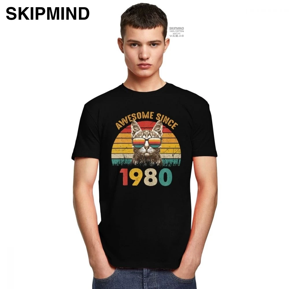Стильная мужская забавная крутая футболка с 1980 года, летняя футболка хлопковая футболка с коротким рукавом, Винтажная футболка, подарок на 40-й день рождения, футболка для любителей кошек
