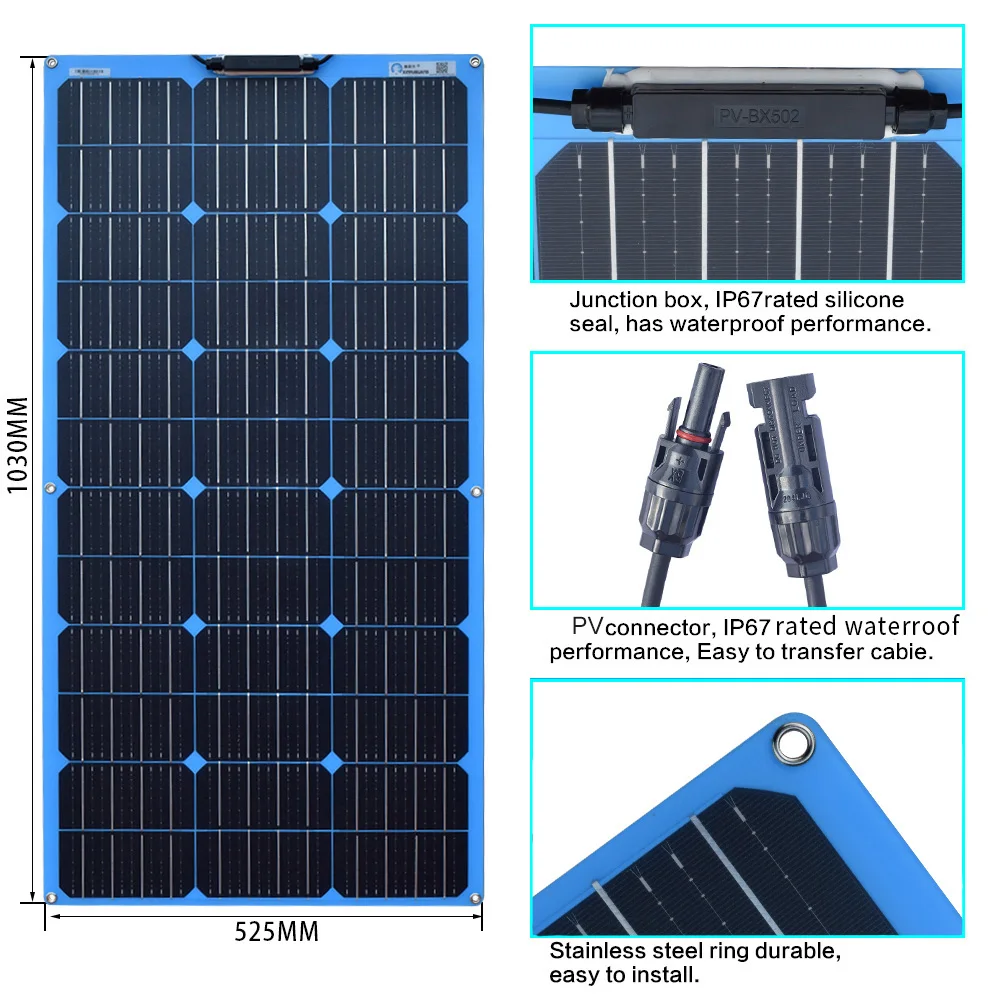 А. Высокая эффективность: выбор высокоэффективных монокристаллических кремниевых солнечных элементов с 12 главными затворами 161*161 мм, эффективность выработки энергии примерно в 1,3 раз выше, чем у обычных поликристаллических, И общая площадь меньше при такой же мощности.B светильник и гибкий: благодаря процессу упаковки компонентов второго поколения, он тоньше, легче, мягче и имеет более длительный срок службы.C. Долговечность: материал ПЭТ по специальной технологии делает его более износостойким и повышает эффективность поглощения солнечного света.D. Высокое качество: обладает высоким коэффициентом пропускания светильник, безопасен и надежен, не боится высоких температур, не подвергается опасности возгорания или взрыва.E. Соединительная коробка IP67 водонепроницаемая конструкция, включая байпасный диод, в цепи используется защита от перегрузки по входу, конструкция с обратной защитой.F. В розетке для сборки используется специальный фотогальванический кабель и специальный фотогальванический разъем PV. Он безопасен, водонепроницаем, устойчив к высоким температурам и погоде для использования на открытом воздухе. PV-коннектор прост в использовании, подключается и работает.G. Этот продукт представляет собой гибкий компонент на солнечной батарее. Рекомендуется использовать с контроллерами и аккумуляторами. Подходит для различных сцен, таких как RV, дом, кемпинг, яхта, уличный фонарь и солнечная электростанция.