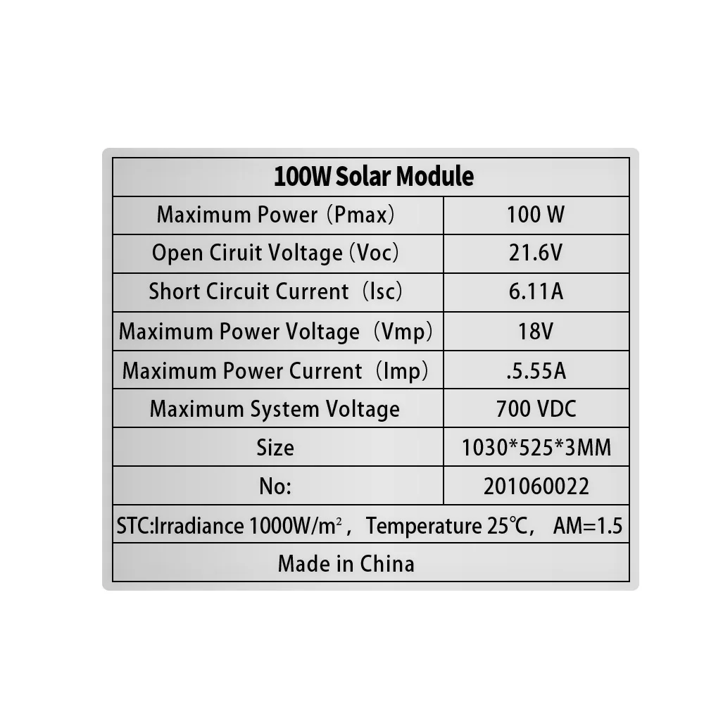 Максимальная мощность (Pmax) 100 ВтДопуск на выходе ± 3%Максимальное напряжение системы 700 В постоянного токаНапряжение холостого хода (Voc) 21,6 вТок короткого замыкания (Isc) 6,11 AМаксимальное напряжение питания (Vmp) 18 вМаксимальный ток мощности (ИМП) 5,55 АКПД 21%Рабочая температура (NOCT) 45 ± 2 ℃Диапазон температур-40 ℃ ~ + 80 ℃Количество ячеек 36 шт.Вес 1800 гРазмер 1030*525*3 ммСиний фонСтандартные условия тестирования: lrradiance 1000 Вт/м2, температура 25 ℃,AM = 1,5