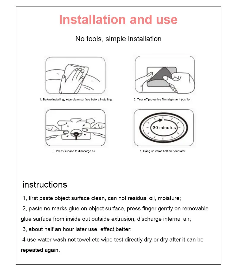 * Шаги установки: 1. Протрите стену перед установкой; 2. Оторвите защитную пленку и поместите ее в положение; 3. Нажмите на поверхность, чтобы выпустить воздух; 4. Повесьте товары через полчаса.