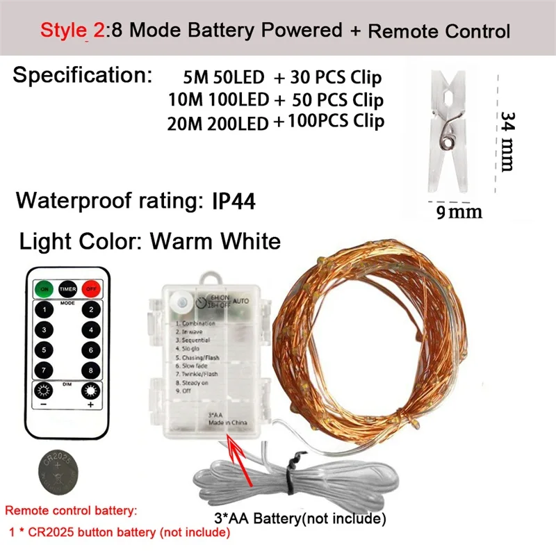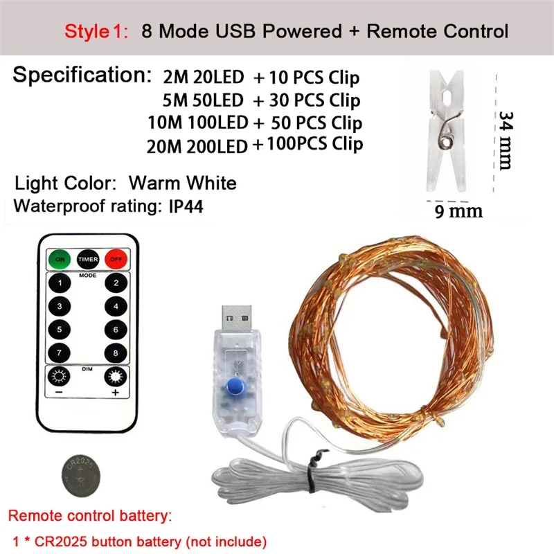 Гирлянда светодиодная на батарейках, 51020м, с зажимом для фото