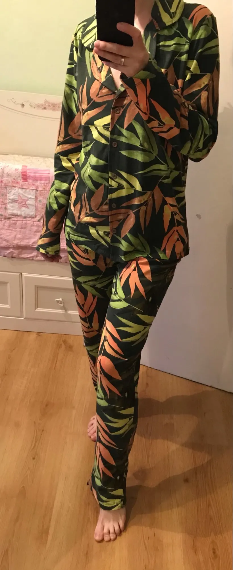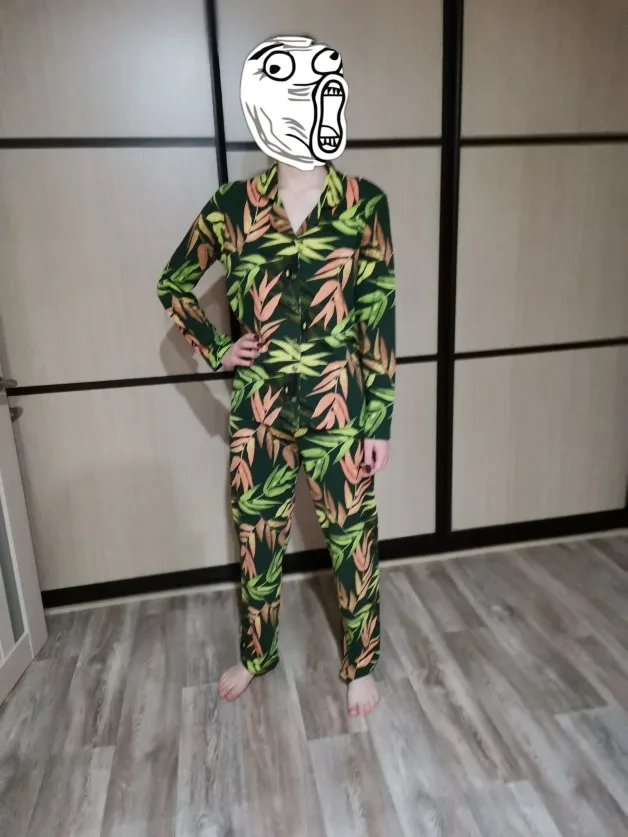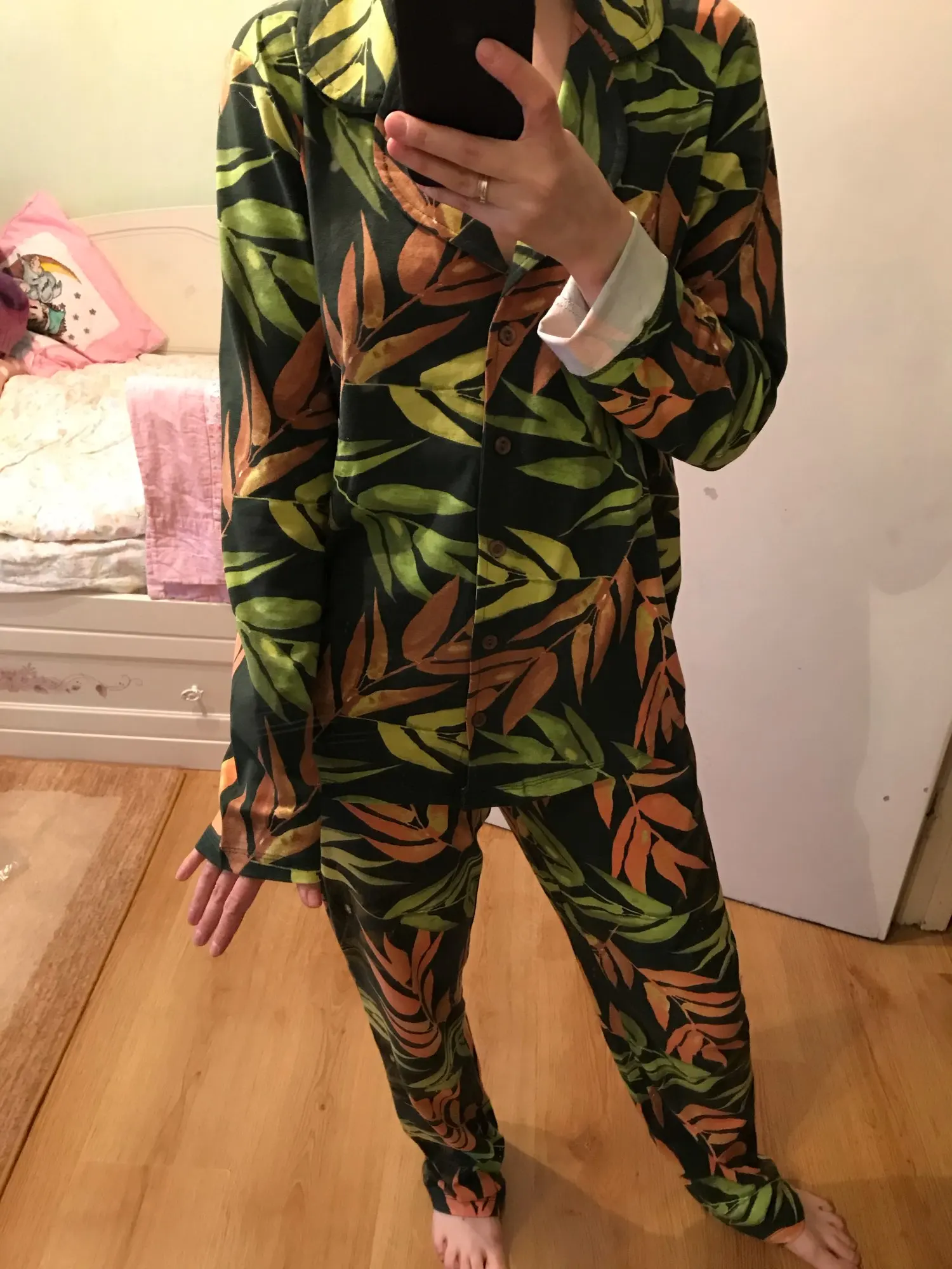 Отличная пижама. По составу эта смесь хлопка, вискозы и эластана. На мои параметры 81-69-94 и рост 170 размер L оказался немного велик. Рукава и штанины не котокие, размер М был бы как раз. Вырез большой, пришлось пришить ещё одну пуговичку. Спасибо продавцу за очень быструю доставку. заказала 11 11 товар пришёл за 8 дней. Купила за 1200 примерно со скидками. Советую к покупке, цена-качество супер. Внутри пижама белая рисунок нанесен сверху на ткань.