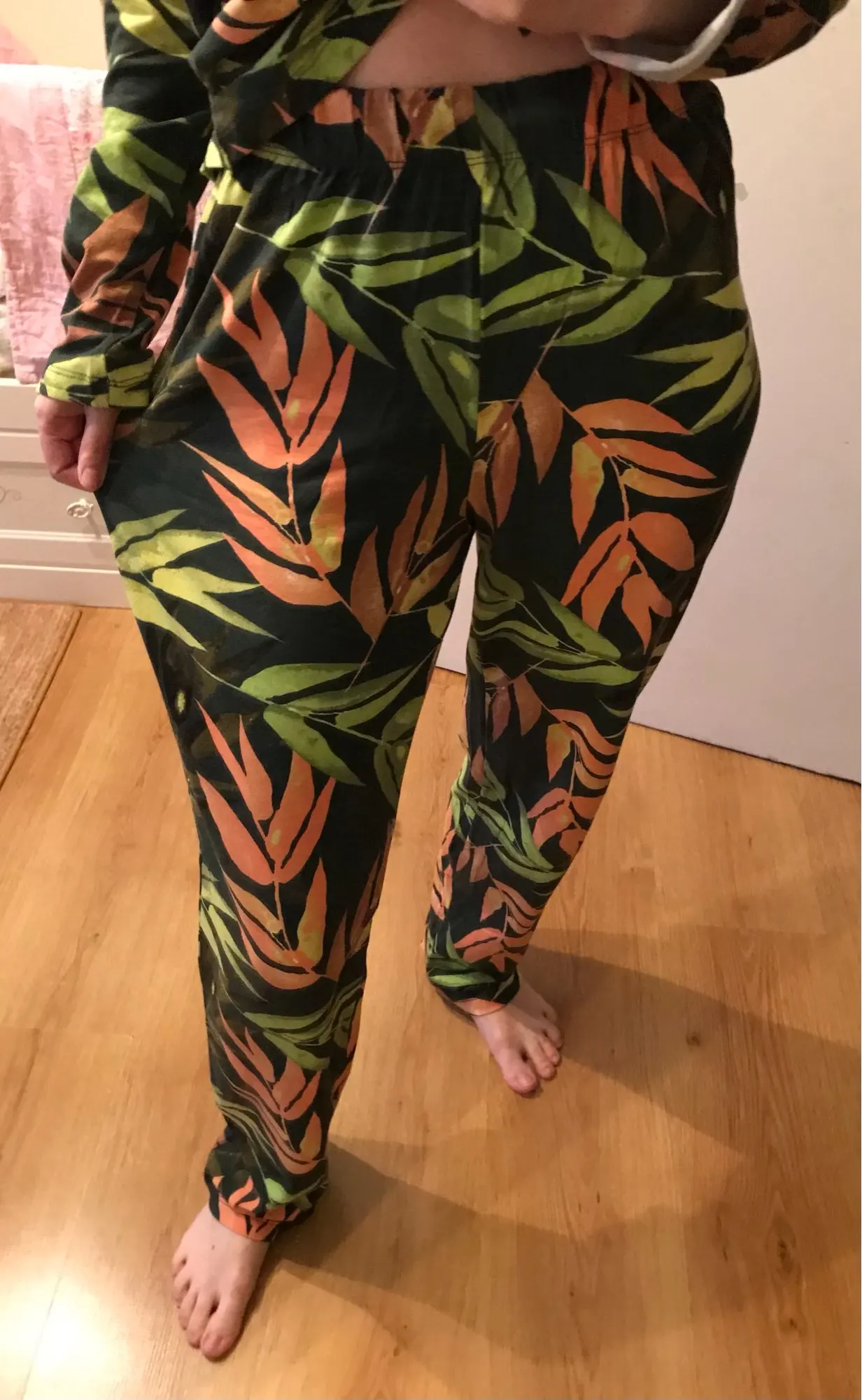 Классная пижама. На параметры 80/62/92 размер S свободный (как и хотела). Брюки в талии велики на сантиметров 6-7. По составу 48 хлопок, 48 вискоза, 4 эластан. Ткань стрейчевая как футболка. Единственное к чему могу придраться это к глубокому вырезу для меня.