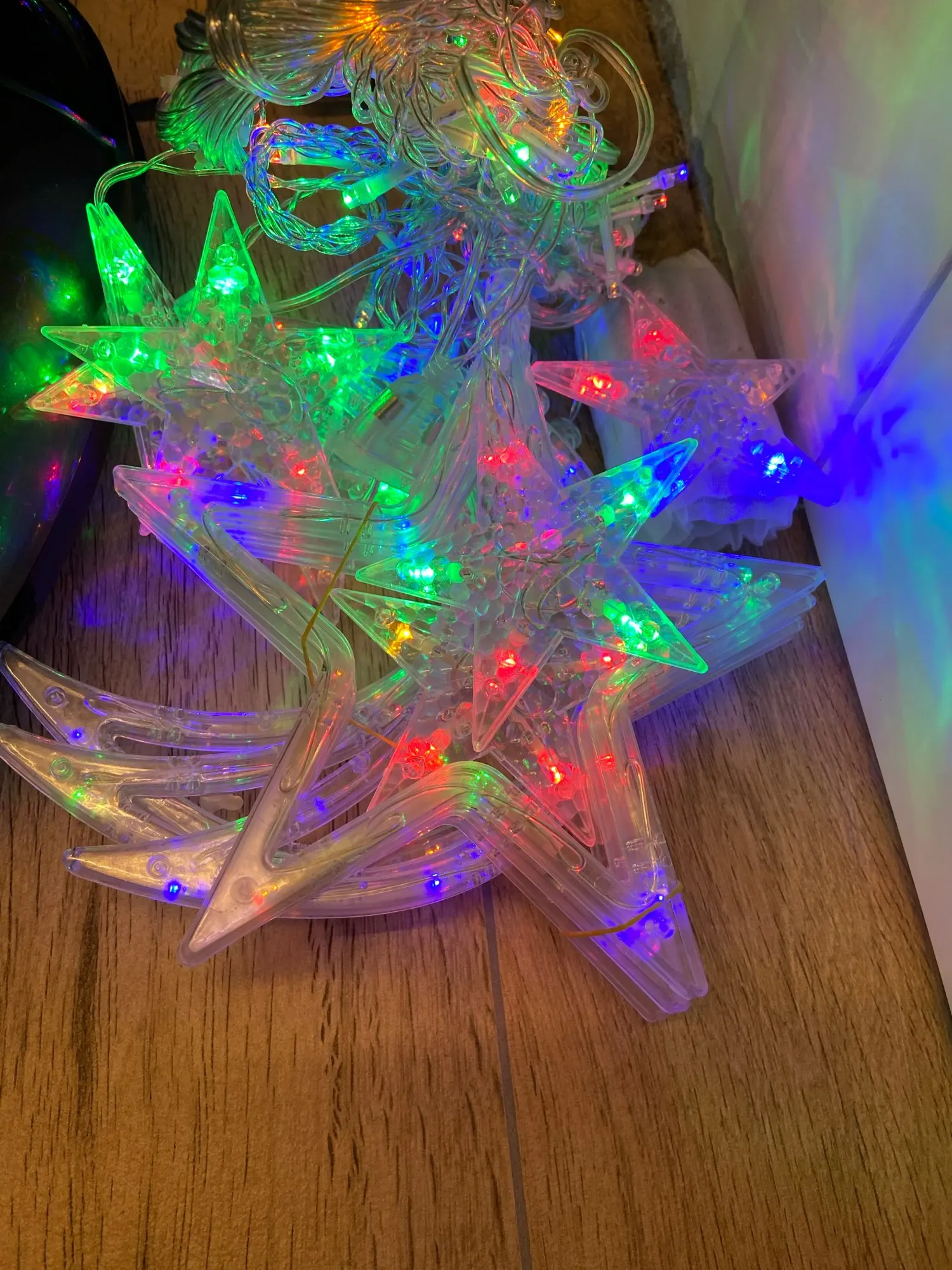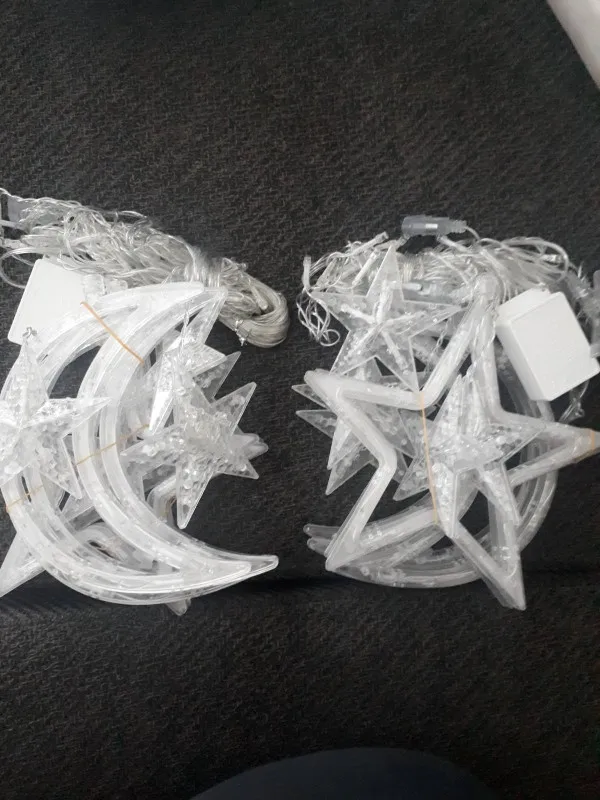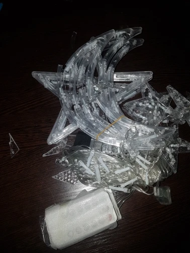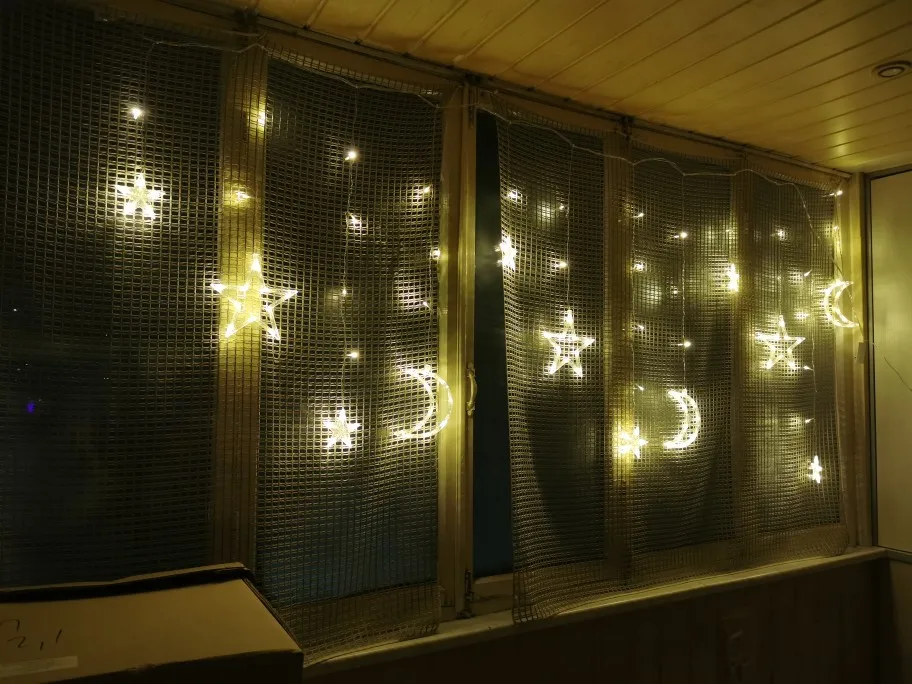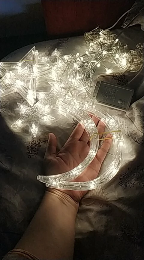 Гирлянда приехала добротно упакованная. При первичном включении всë работает, надеюсь, и дальше будет) Большие элементы - полумесяцы и звёзды - неожиданно очень большие, больше моей ладони! см. фото