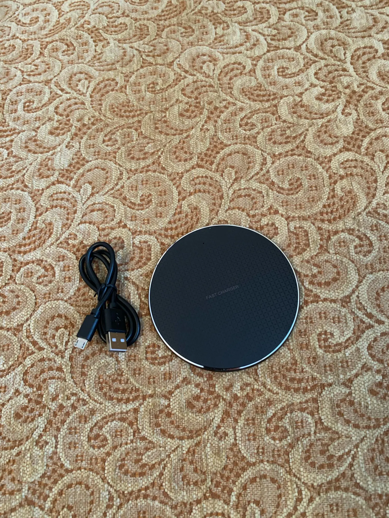 Заказывала для Самсунг ноут20, заряжает его, но медленно (в описании так и написано, что заряжать будет с обычной скоростью) но пойдёт. зарядка- пластик, очень лёгкая, не тяжелее ручки, сверху тоже пластик, телефон с неё легко соскальзывает, на донышке силиконовые "ножки" так что сама она не скользит по поверхности. Очень короткий провод. Разъём микро-USB. Посылка дошла за 2 недели, отслеживалась хорошо.