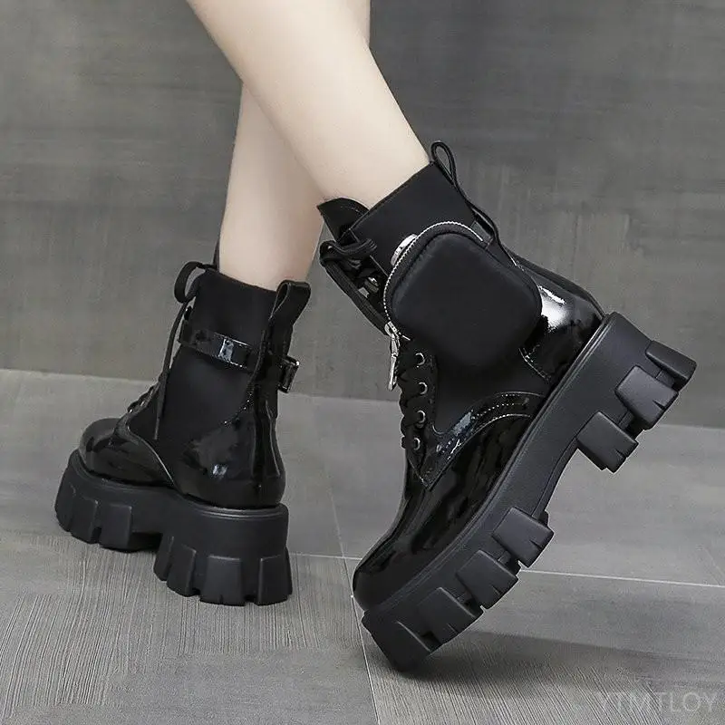 Ботильоны женские из лакированной кожи, на платформе, каблук, с сумкой и пряжкой, ботинки с перекрестной шнуровкой