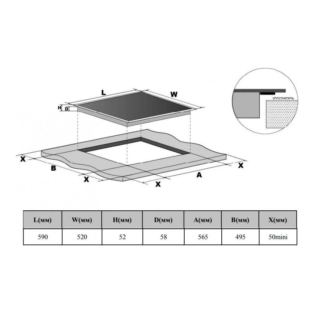 Глубина варочной поверхности52 см