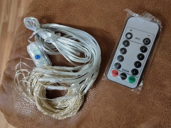 Красиво выглядит, пришло всё целое, в пульт нужно докупать батарейку. Этот дождик изготовлен из легко гнущейся проволоки, руки не царапает, всё нормально