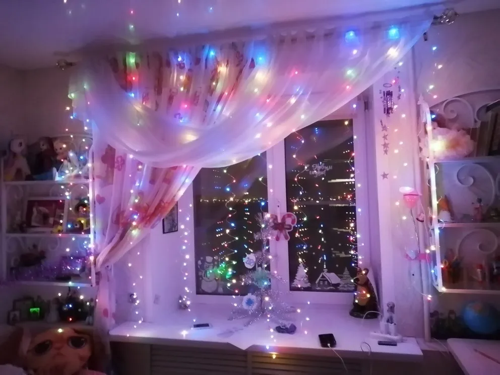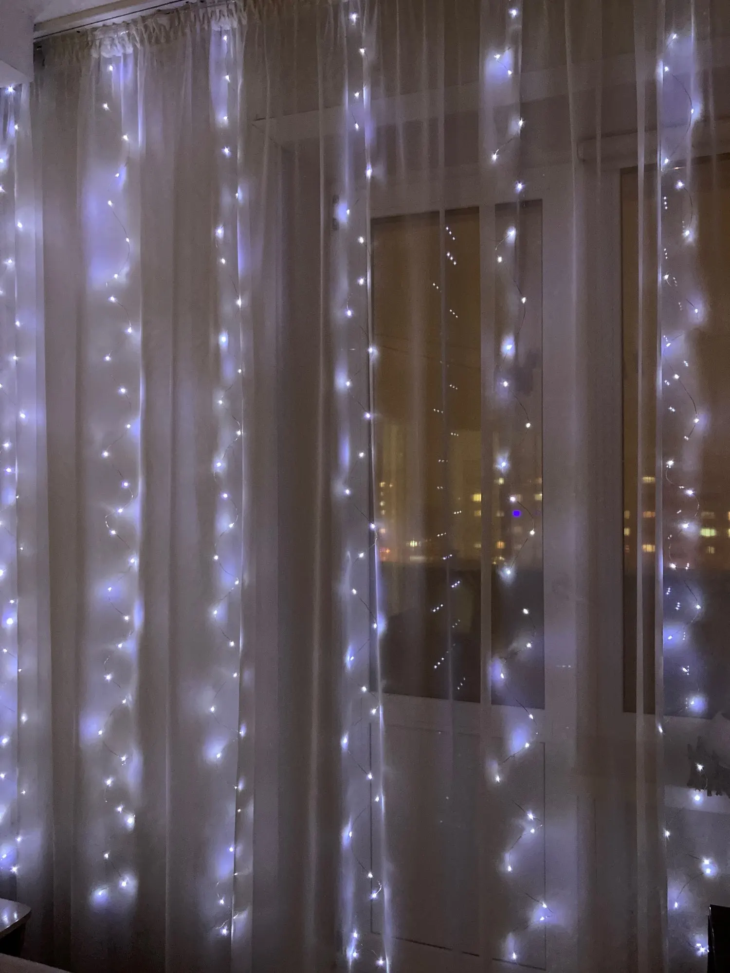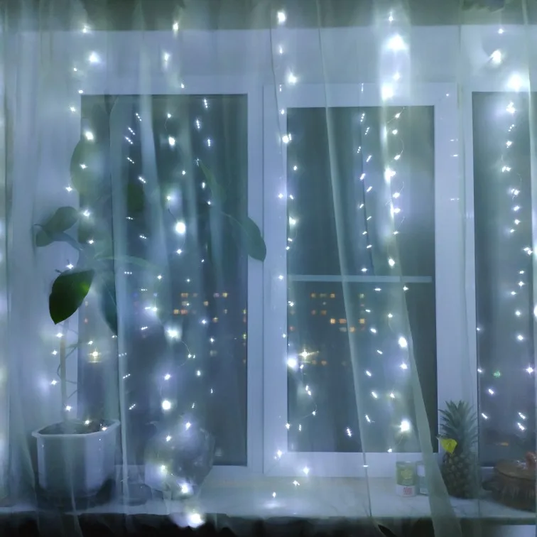 Очень крутая гирлянда, единственное, нужно понимать, что между висящими нитями 30 см. Я сложил пополам и смотал изолентой. На окне смотрится очень хорошо, создает праздничное настроение! Очень маленькие диодики, супер! Всем рекомендую, приехало, кстати, очень быстро-2 недели ровно!!!!!!!
