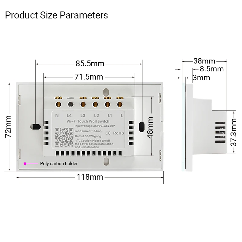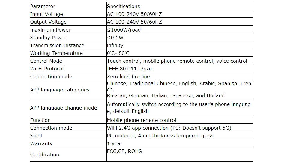 A. Модель: сенсорный переключатель Wi-FiB. Напряжение: 100-240 ВC. Стандарт беспроводной связи: Wi-Fi 2,4 ГГцD. Рабочая среда: -30 ~ 70 градусов Цельсия; Менее 95% относительной влажностиE. Материал панели: закаленное Хрустальное стеклоF. Основной материал: пластикG. Механический срок службы: 100000 раз работы