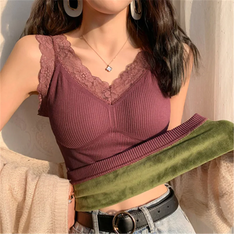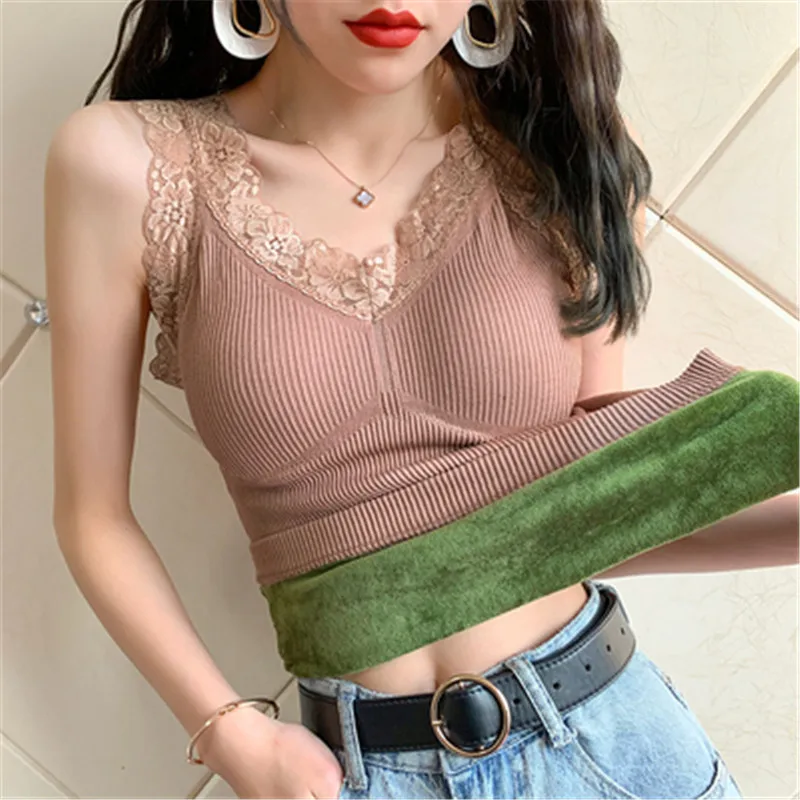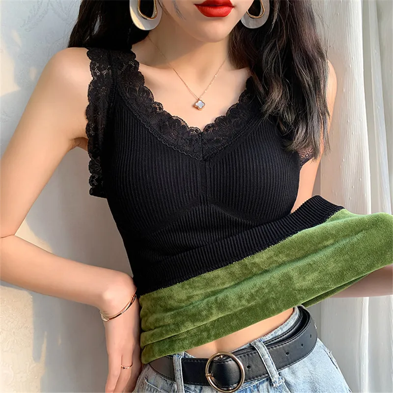 Женская кружевная майка в стиле пэчворк, сезон осень-зима, теплая плотная бархатная майка, Женский облегающий жилет без рукавов с V-образным вырезом, вязаное нижнее белье, топы AB2012