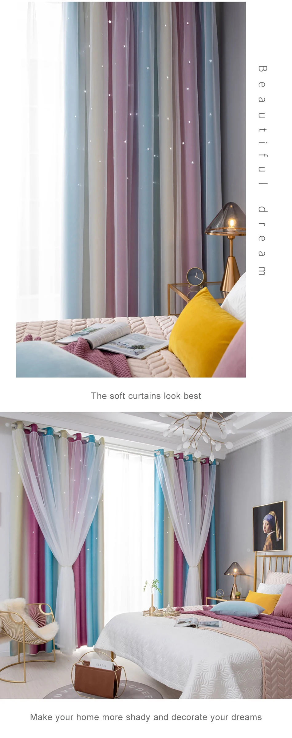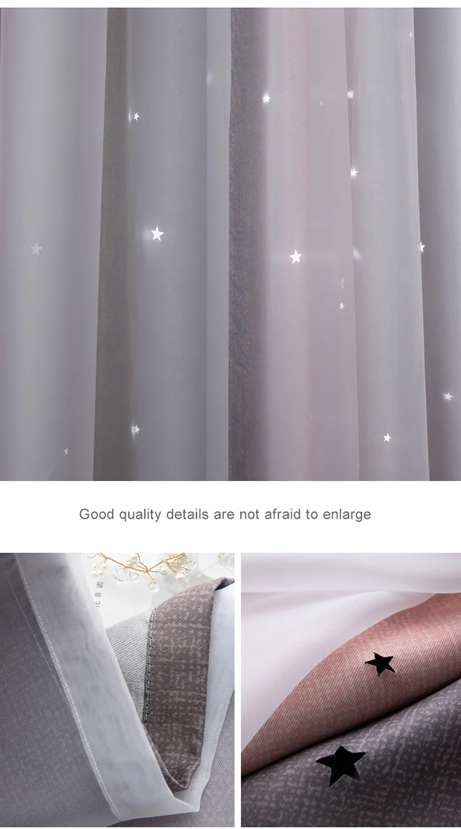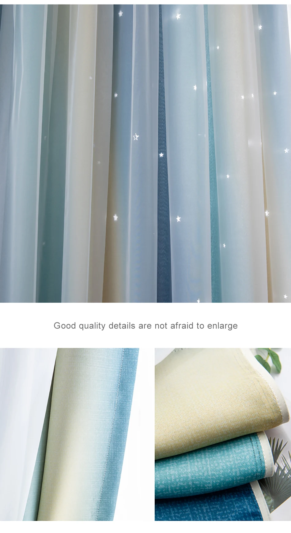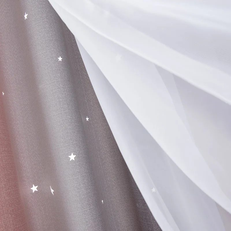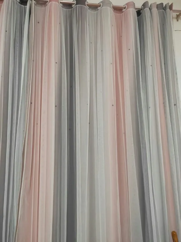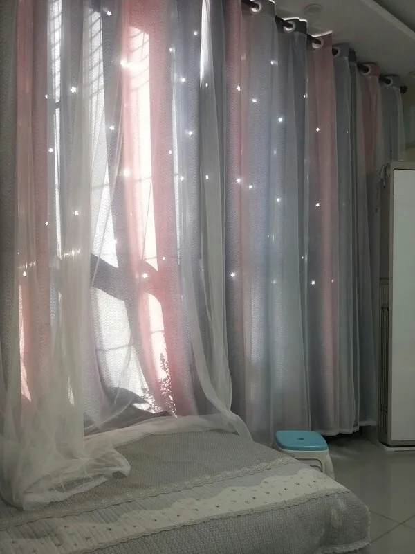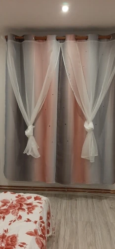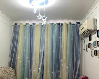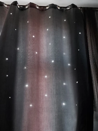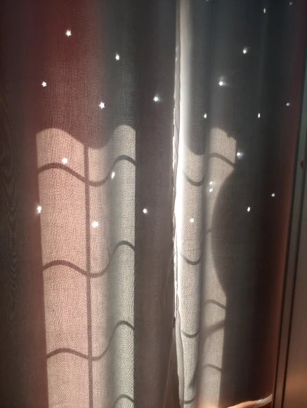 Стиль красивый, ткань удобная и без запаха, устанавливается сразу же, как только она вернется, и размер в самый раз. Цвет фантастический, ширина складок, предложенных службой поддержки клиентов, очень красивый, выдолбленные звезды светятся, как звезды на небе, блестящие, очень красивые, не только пылезащитный и красивый, он выглядит не грязным, марля очень интегрирована