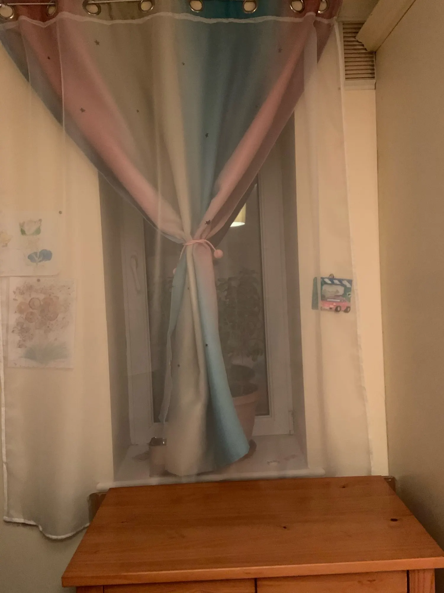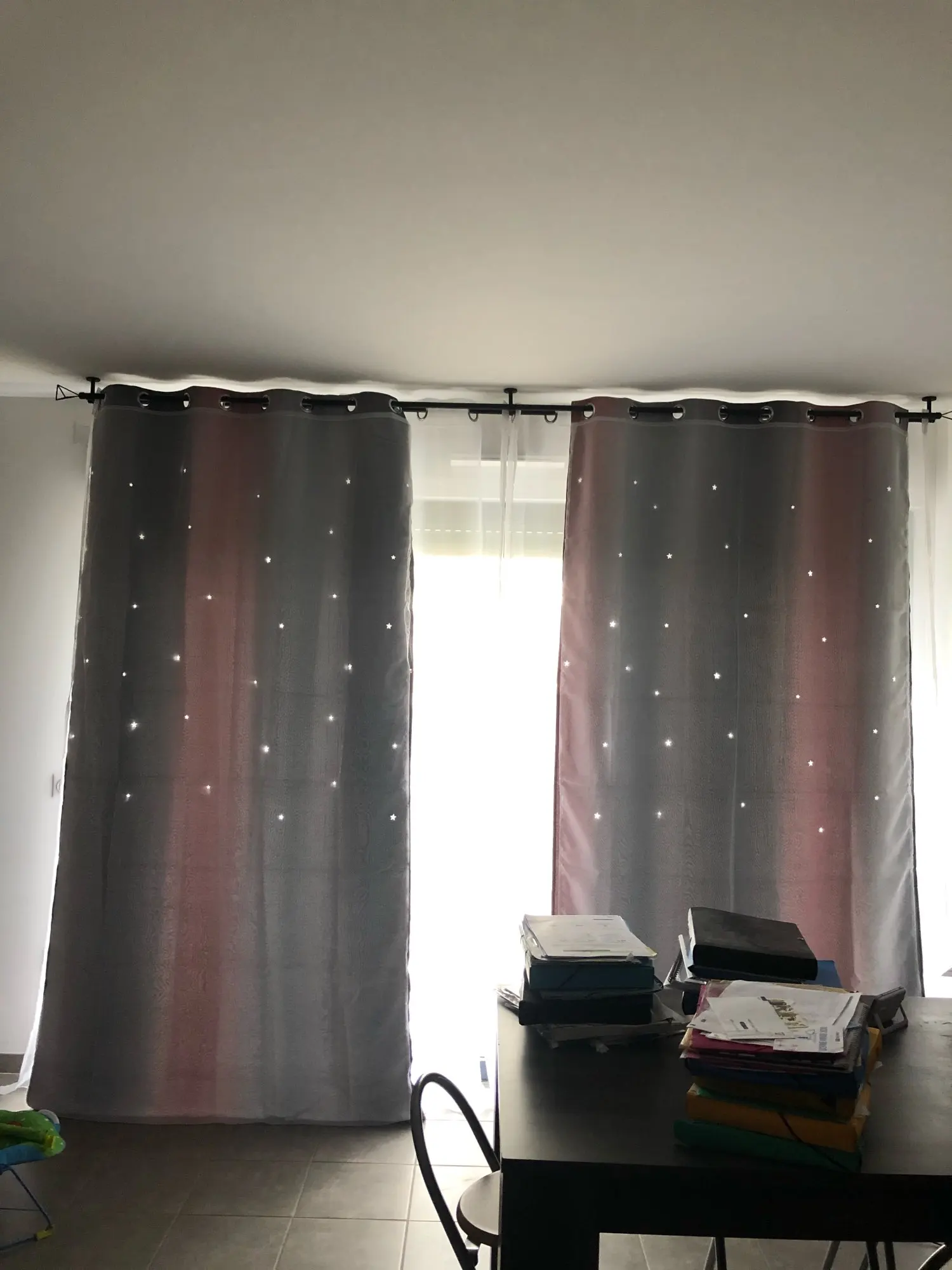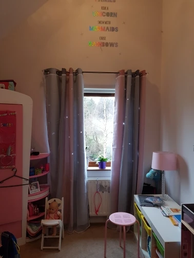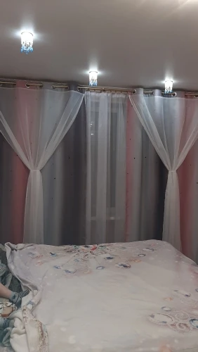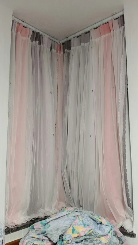 Там великолепный, мне нравится серый с розовым, они очень длинные, я должен был поставить планку почти прикоснувшись к потолку, и они все еще немного ударили по полу, но я не возражаю, я думаю, что это выглядит потрясающе. Я бы хотел, чтобы они были немного полнее, я заказал 100 см x2 и 150 см x2 панели лучше подходили, я думаю о паре, чтобы она выглядела более полной, она была 40 что-то долларов за 2 и его стоит 100 процентов того, что я люблю их так сильно рекомендую deff