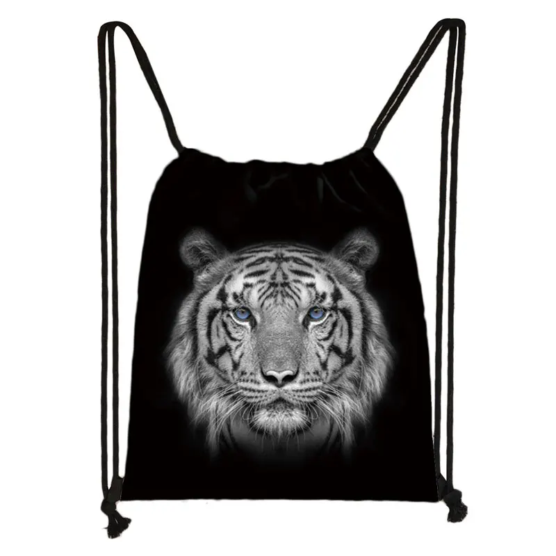 Черно-белая сумка на шнурке с принтом диких животных, мужские сумки для хранения, рюкзак для мальчиков с изображением тигра льва, волка, Подростковая дорожная сумка, Книжная сумка