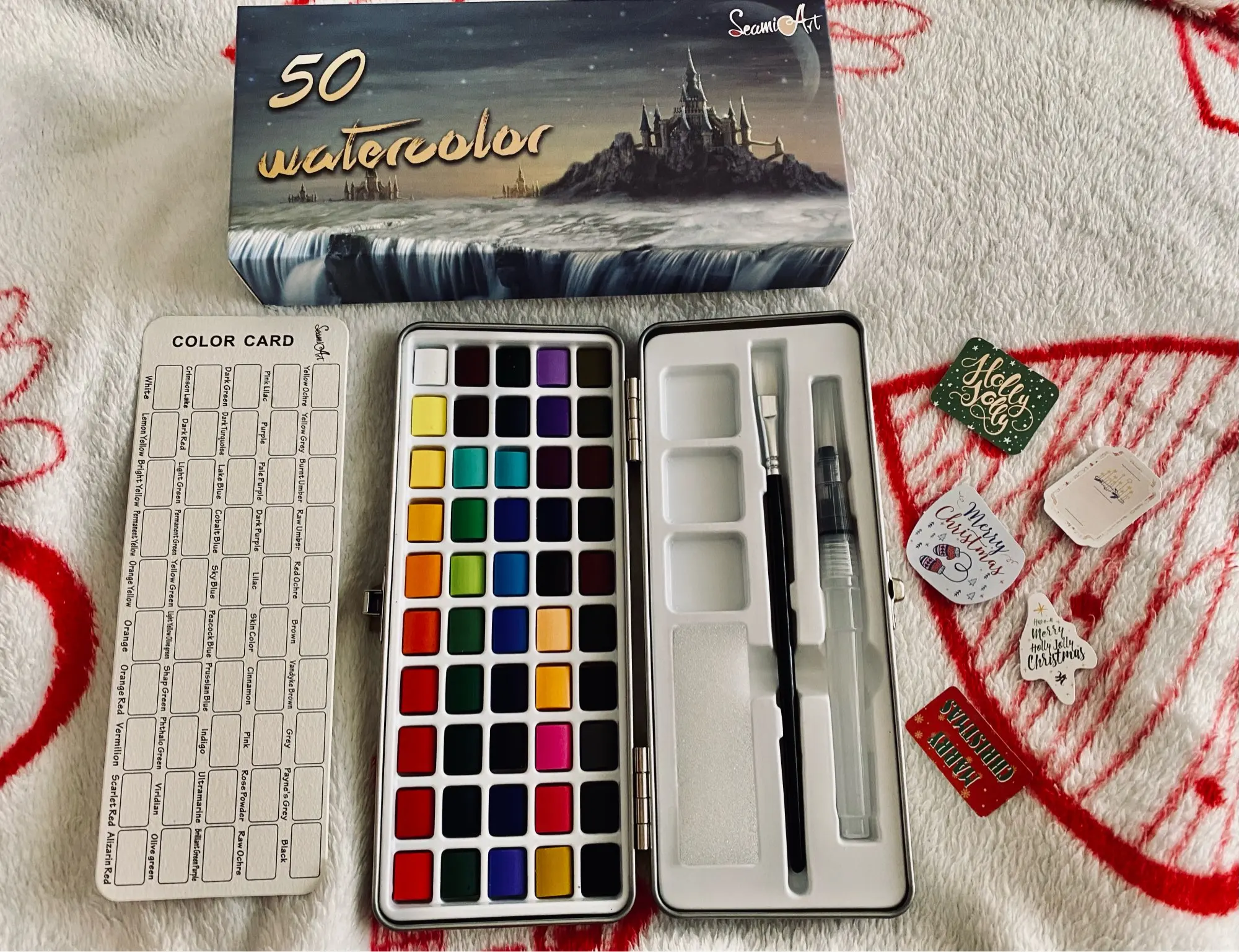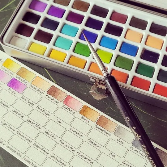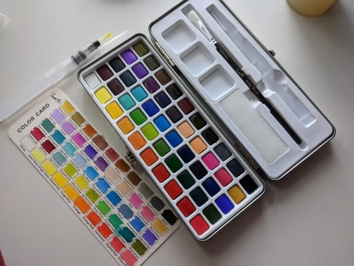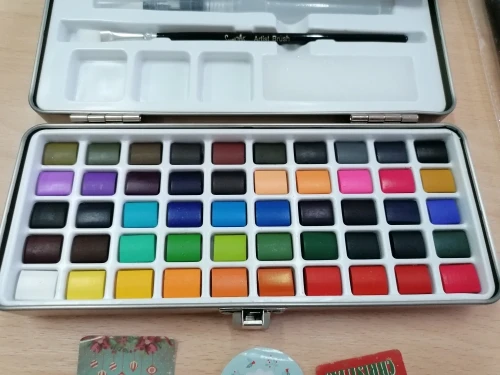 я невероятно счастлива! эти краски великолепны!!! упаковано было очень хорошо. красивая коробка, выглядит очень презентабельно. пенал-палитра выполнен качественно, с замочком. сами краски очень яркие, насыщенные. огромное количество цветов позволяет не ограничивать себя в творческом процессе. расход красок минимальный за счёт отличной пигментации. потому красок хватит надолго. в комплекте есть две кисти плоская и с баллоном для воды. синтетика, но оочень мягкая. ,я в восторге!!!! это идеальный набор! открыв пегая я обнаружила несколько наклеек новогодней тематики. это очень мило и необычайно приятно. отдельное спасибо продавцу за знак внимания!!!