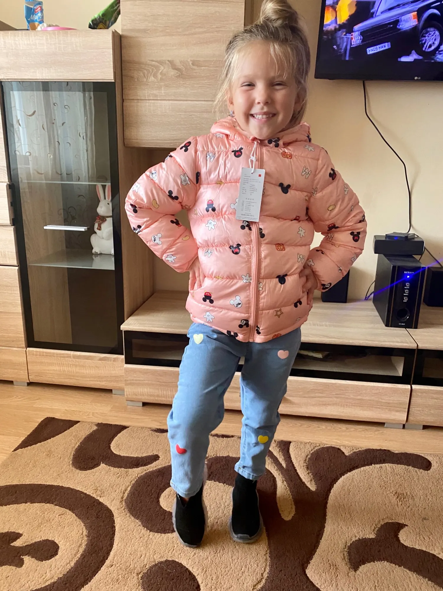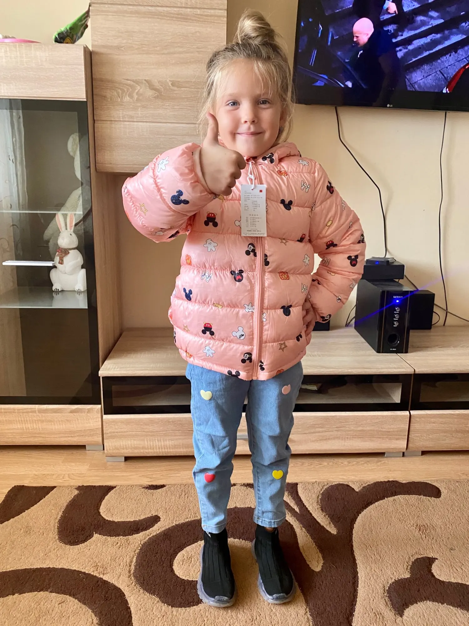 Цвет в реале не совсем розовый, скорее розово-персиковый. Взяли 6Т (носим 110) и курточка с запасом хорошим. Качество очень хорошее, нитки не торчат, неприятного запаха нет. Трек номер отслеживается. Доставка быстрая, около недели.