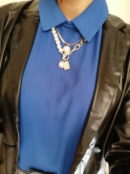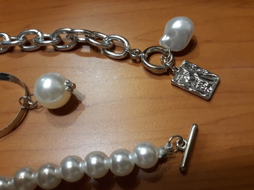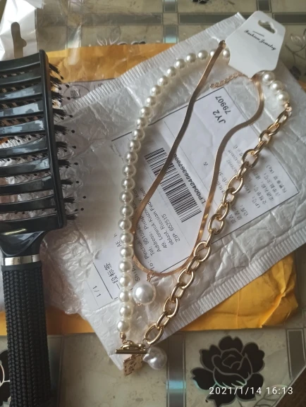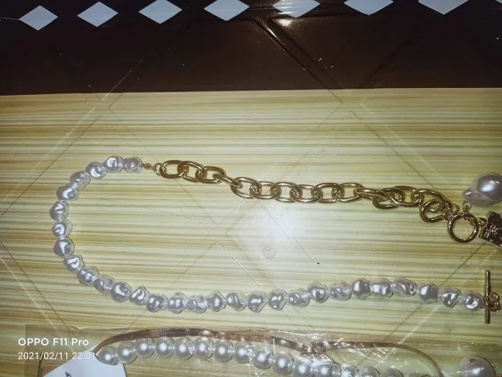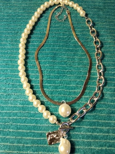 На картинке выглядело лучше...В жизни очень грубая работа, дешевая пластмасса, бусины ужасные...даже не гнутся, просто колом стоят. Это два украшения в одном, цепочка отдельно от ожерелья. От короткой цепочки сняла бусину, буду носить без нее. Ожерелье не надену точно..