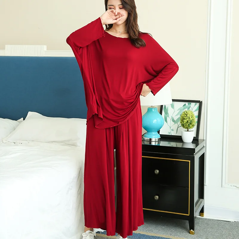 Домашние костюмы больших размеров, Новинка осени, свободная пижама с длинным рукавом, комплект из двух предметов, брюки с укороченными широкими штанинами, пижама, женская одежда для сна