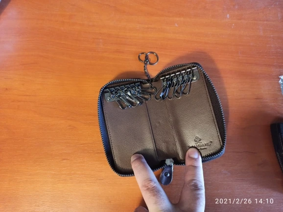 Нормальная ключница. Очень вместительная, хотя поэтому очень толстая, не в каждом кармане нормально разместится. Швы выглядят неплохо. Кожа не воняет. Но, по моему, кожа для контактирующей с металлическими ключами излишне мягкая и молния чуть выпирает наружу, возможно будет быстро изнашиваться. Упакована была хорошо.