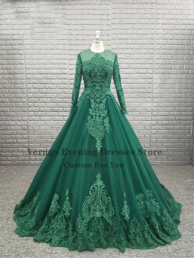 Verngo Зеленые Вечерние платья с длинным рукавом кружево, аппликация бисером Роскошные дубайские женские вечерние платья