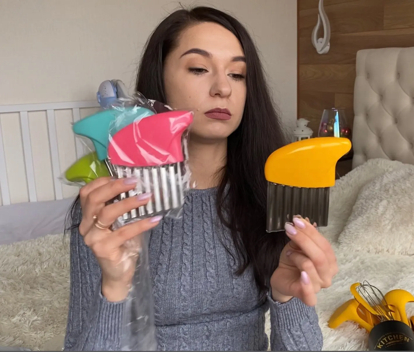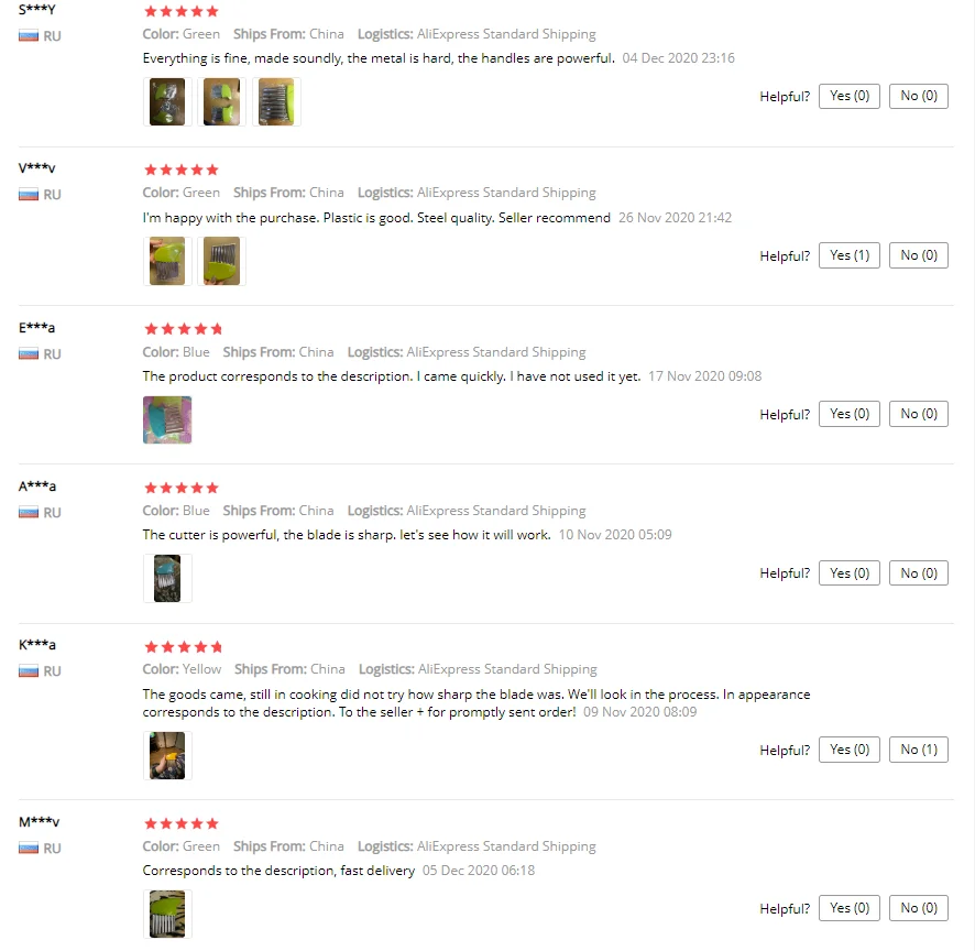 Продавцу 10 баллов из 5. Заказывала 6 товаров, все пришли идеально упакованы, ещё и крючок в подарок (делала заказ на распродаже 11.11 и скидка была приличной). Слайсер немаленький, удобно лежит в руке, острый. Товар и продавца рекомендую!